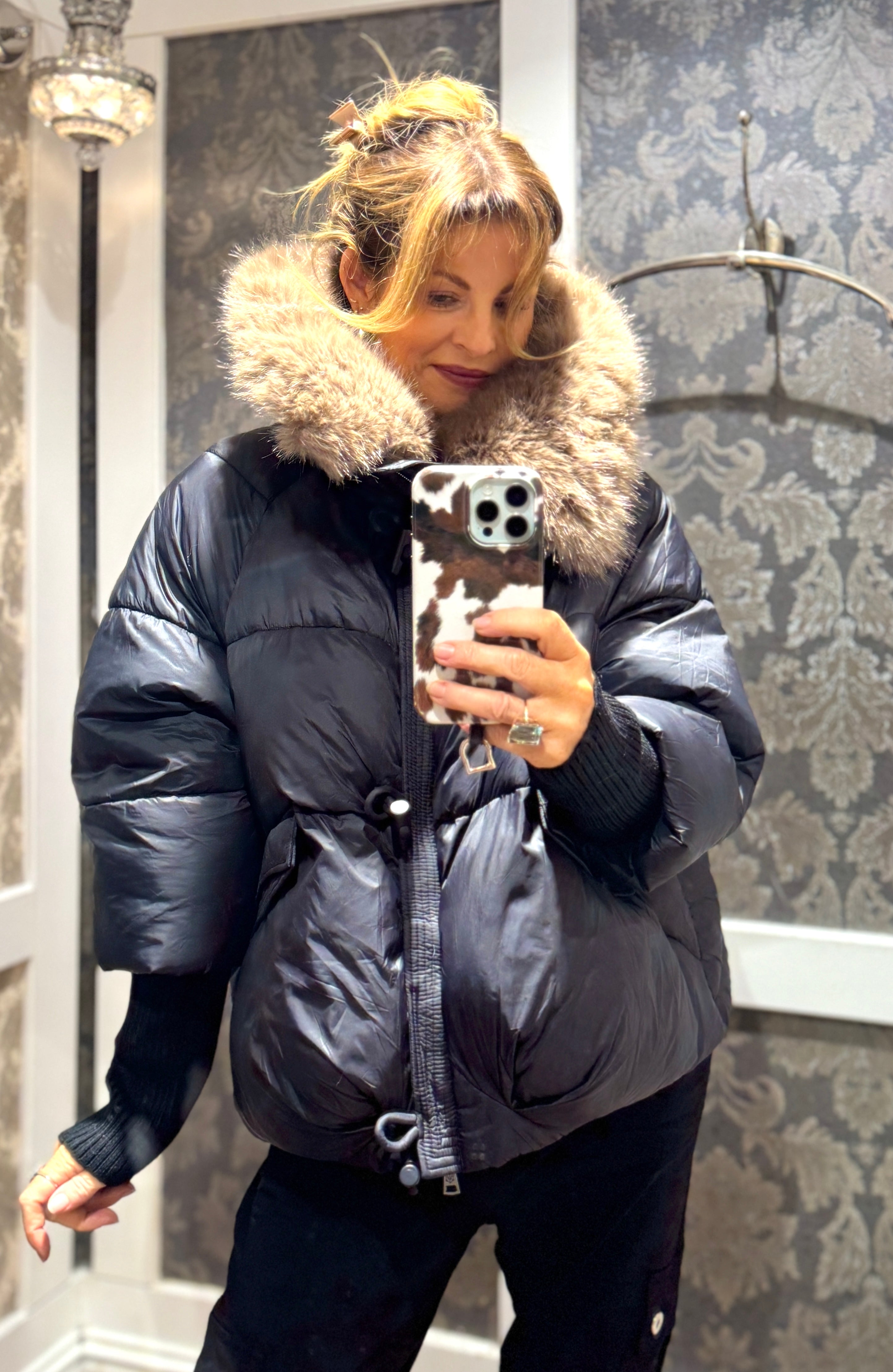 A classic black coat perfect for winter time, a chic brown fur removable collar adorned along the collar. An easy way to stay cosy and look stylish, perfect to layer up any outfit. Tight knitted arms are comfortable and provide a feminine silhouette. Folded pockets with a double closured front add extra pizzaz.