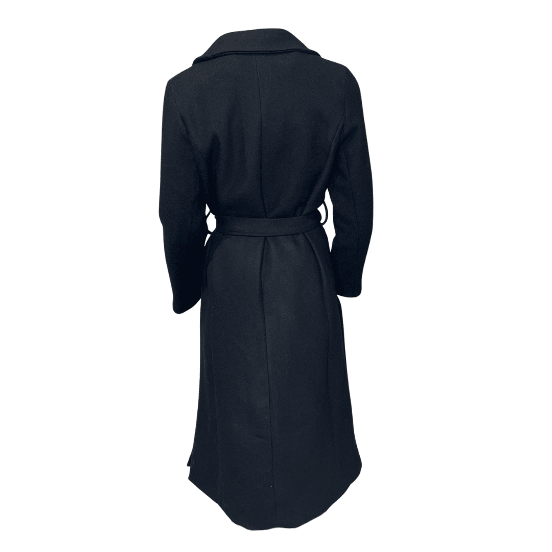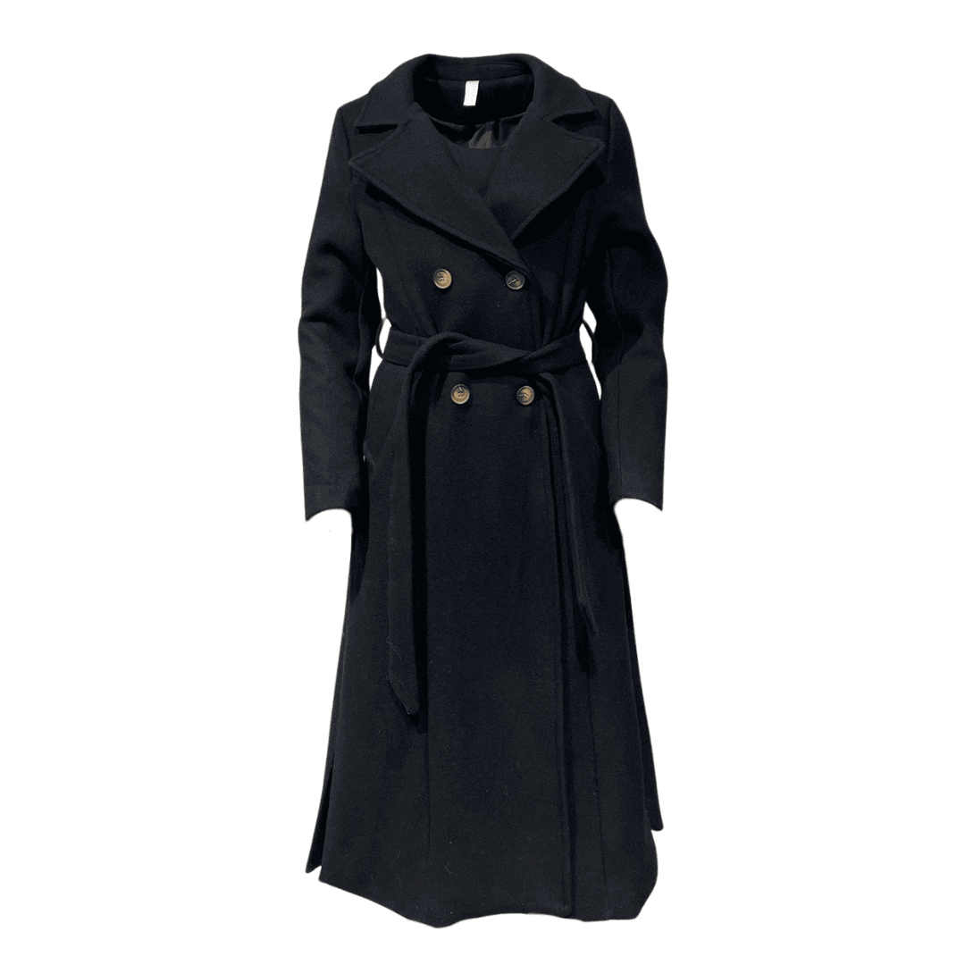 This elegant, French-inspired coat combines comfort and sophistication effortlessly. Featuring beautifully crafted collars and buttons for added warmth, the tailored waist tie enhances a feminine silhouette. Practicality meets style with two deep side pockets, making this timeless black coat a chic and functional wardrobe essential.