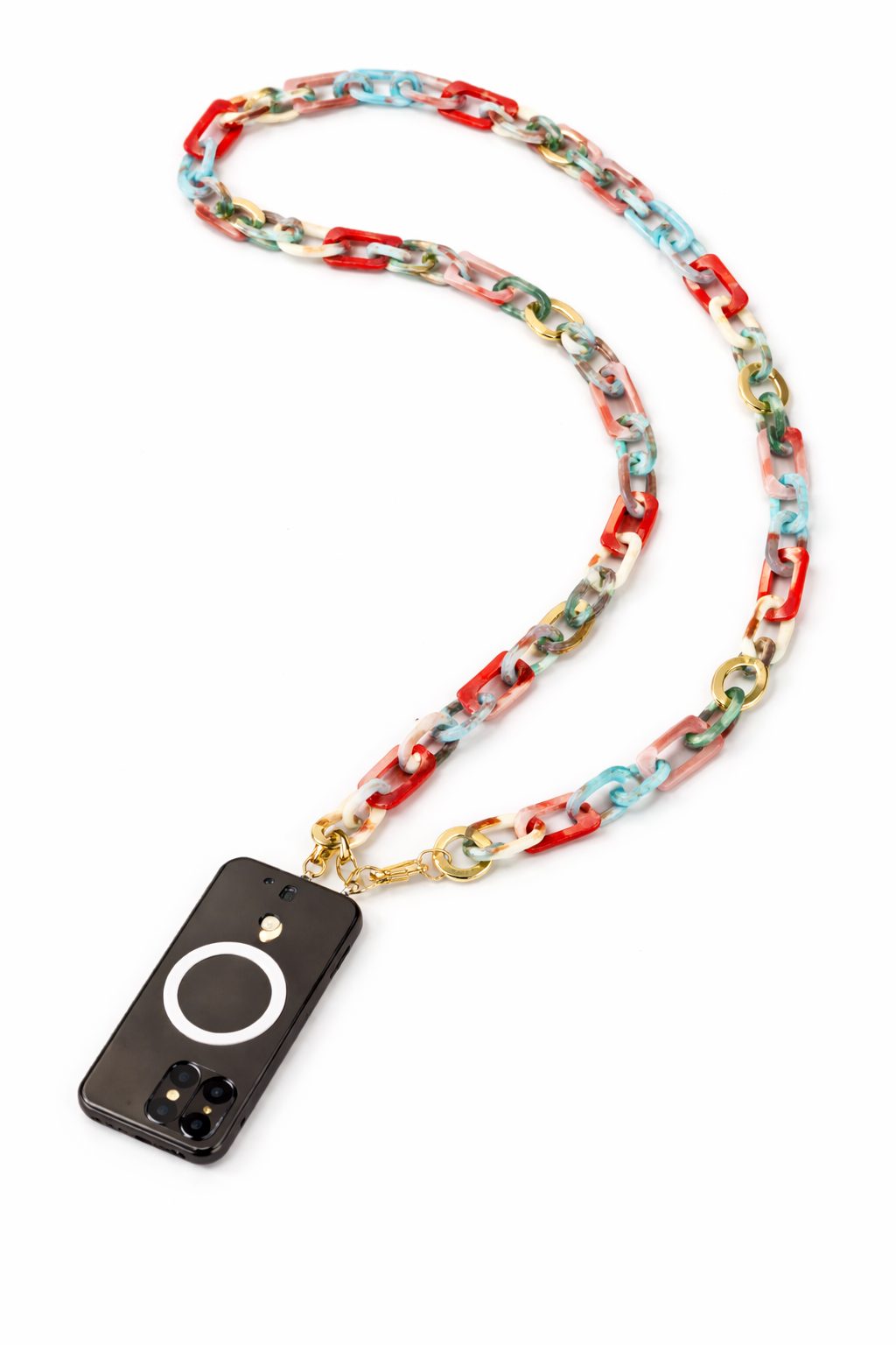 A quirky and practical Phone Chain. Perfect for wearing crossbody or over the shoulder, it adds a fun, elevated touch while keeping your phone close and accessible. Ideal for everyday wear, festivals, and travel.