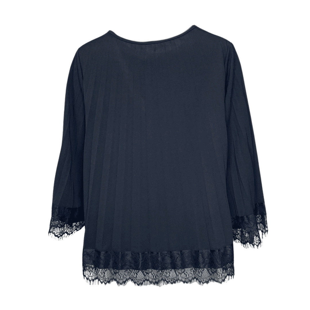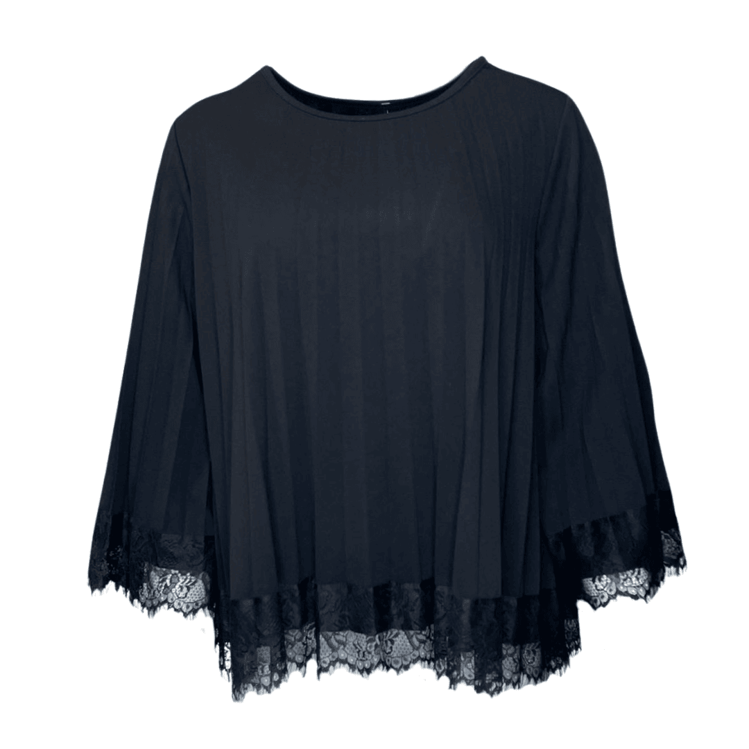 This stunning, flowing top blends elegance with ease, featuring pleats that bring both shape and flair. Its cape-like design pairs beautifully with any trousers, while the lace sleeves add a touch of chic sophistication.