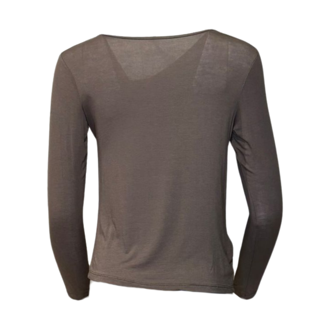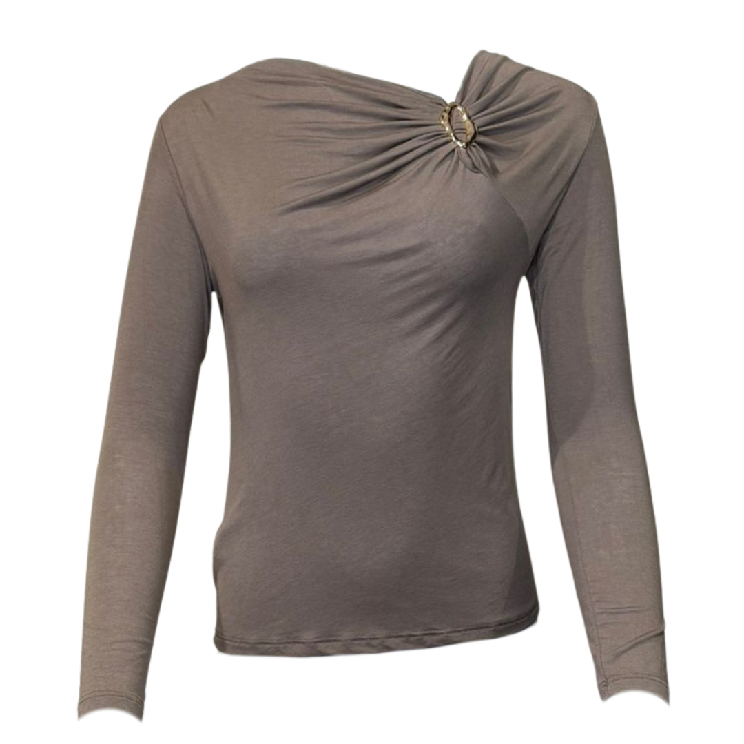 A beautifully soft lightweight wool top with long sleeves—lightweight, comfy, and perfect worn on its own or as a chic layering piece. Finished with a gorgeous gold brooch placed at the collarbone for extra flattery and standout style can dressed up or down elevate your basics!!