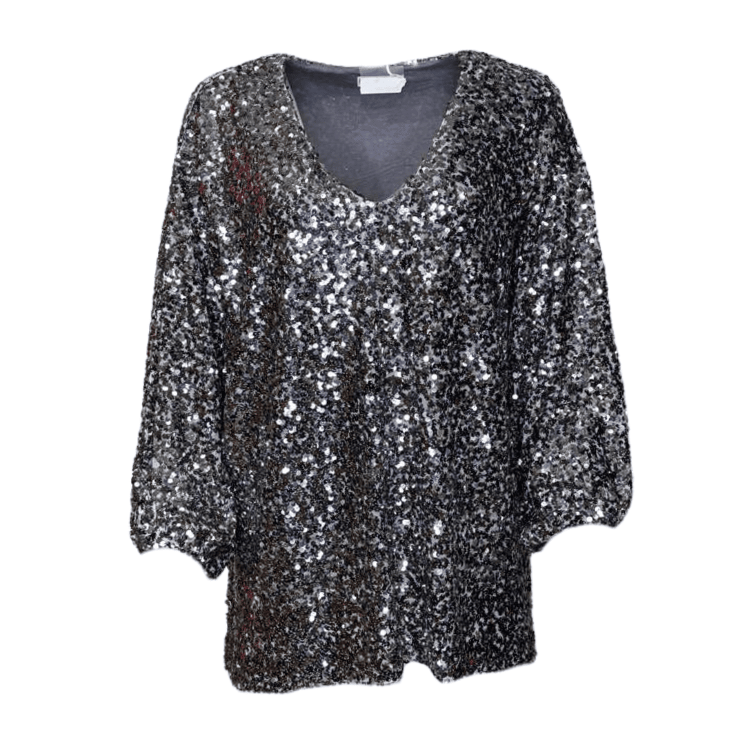 Feminine and stylish, this metallic grey sequin top features a flattering V-neckline, flowing bat sleeves, and a relaxed silhouette. Fully lined for comfort, it’s a shimmering statement piece with effortless elegance.
