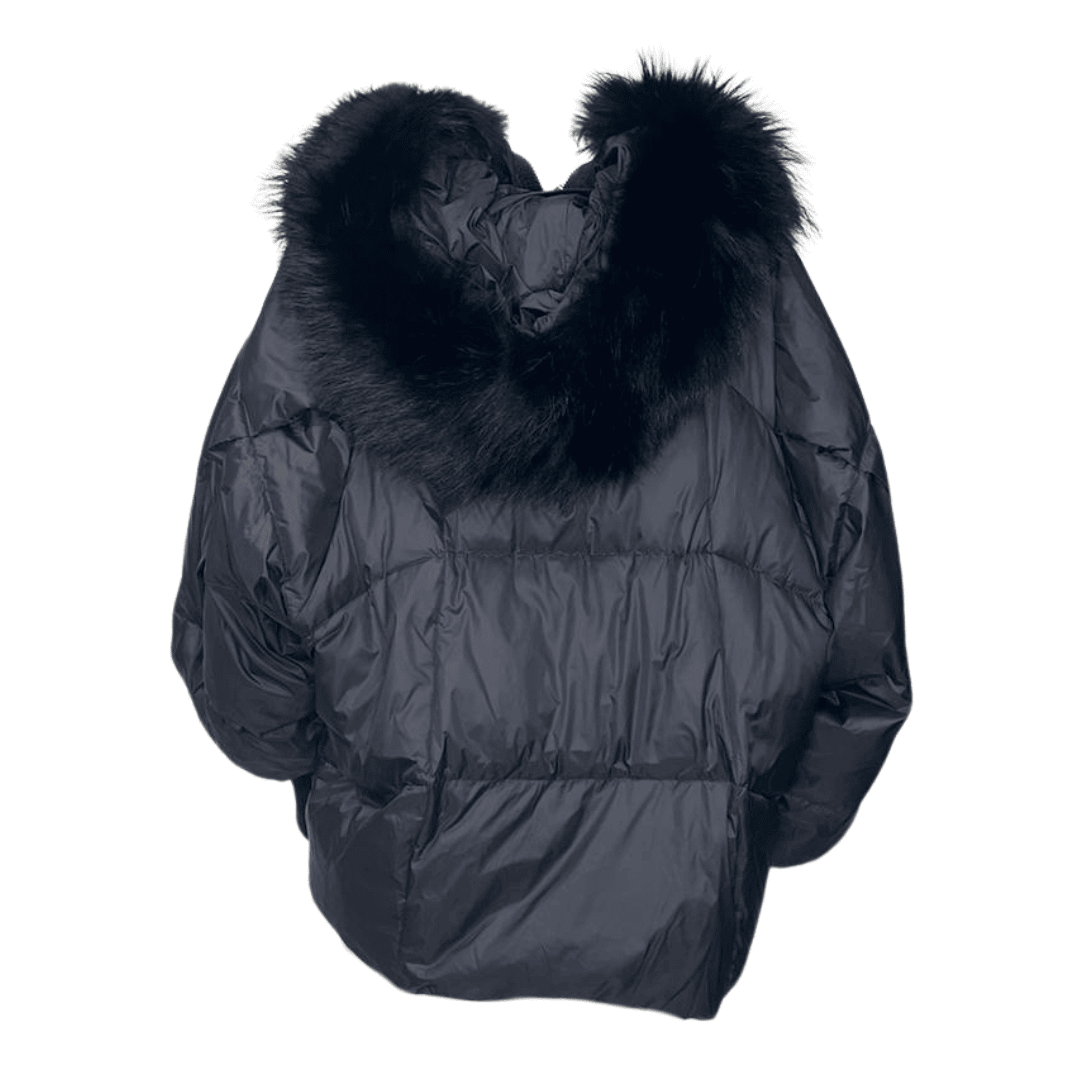 This edgy black puffer jacket features a detachable fur-lined hood, ribbed sleeves for a snug fit, practical pockets, and an optional elasticated waist for a flattering shape. A cozy essential with a sleek, versatile edge.