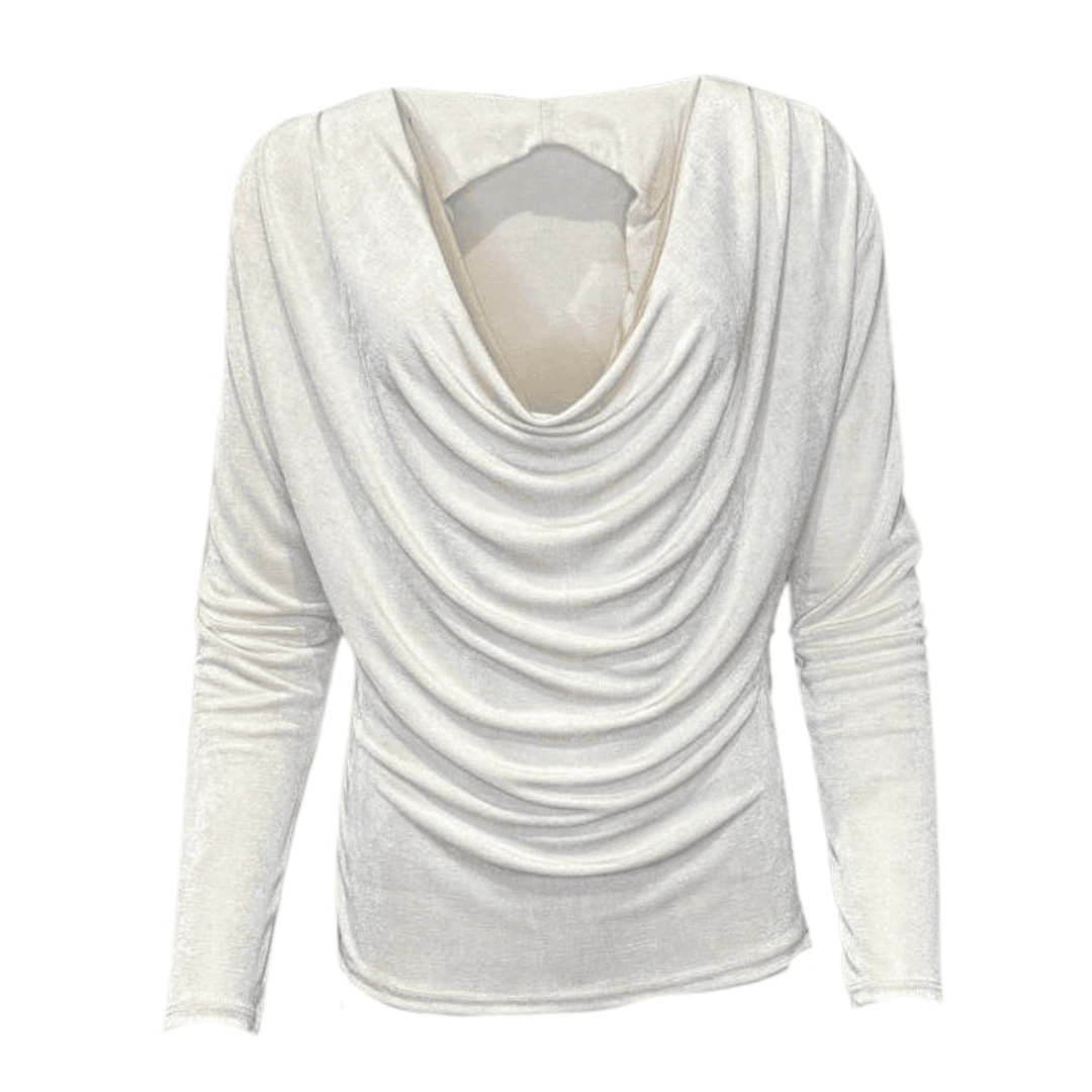 Wrap yourself in comfort with this super soft cream top, featuring long sleeves, a draped cowl neckline, and a subtle glittery finish. Perfect for adding a touch of sparkle to your everyday style.
