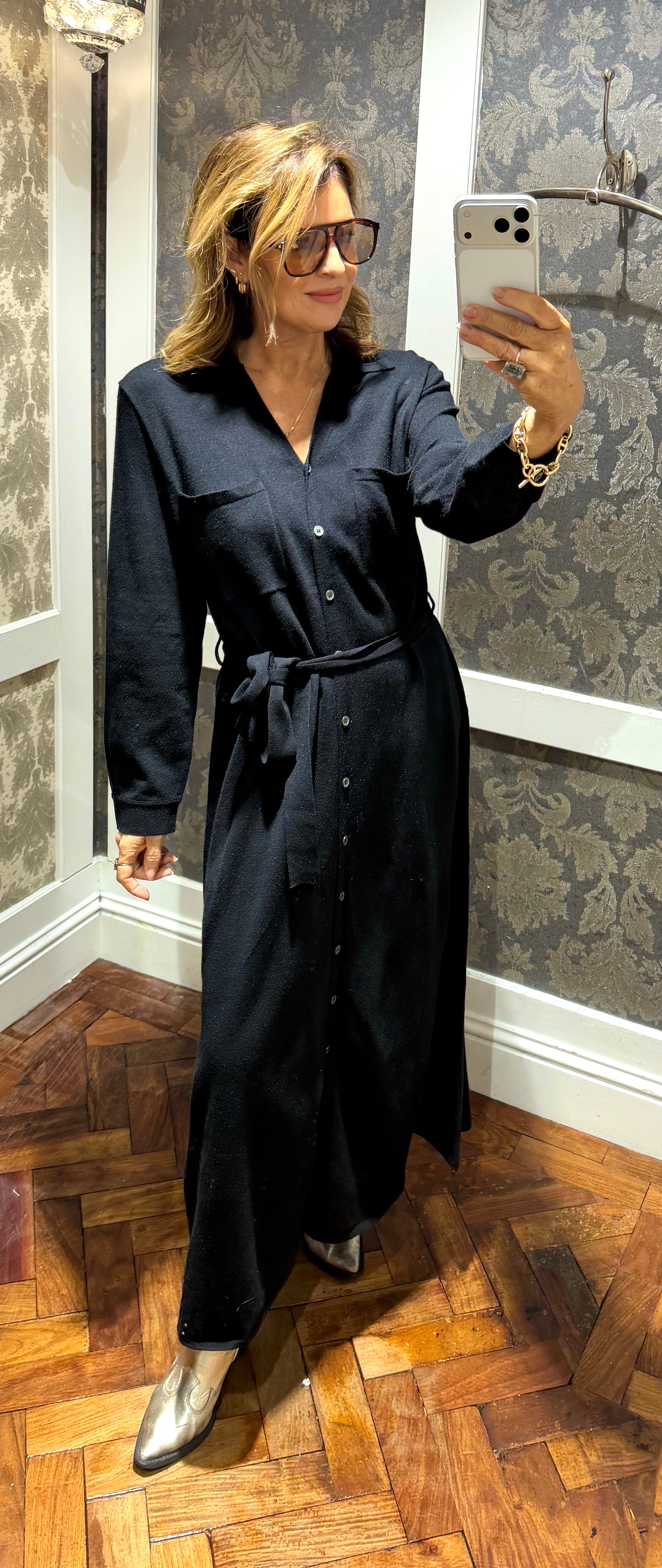 A fab, lightweight dress featuring a chic collar, chest pockets, and a button-up front, complete with a stylish tie-waist belt. Longline, comfy, and effortlessly elegant. Great to dress up or down.