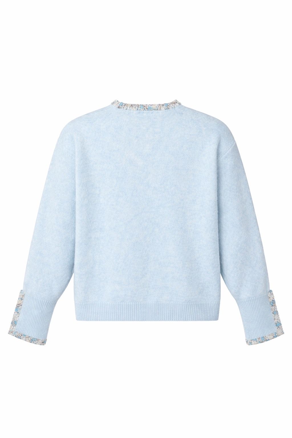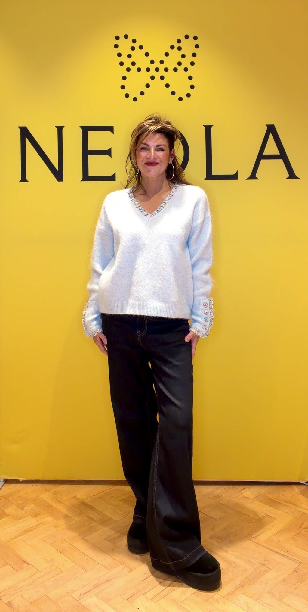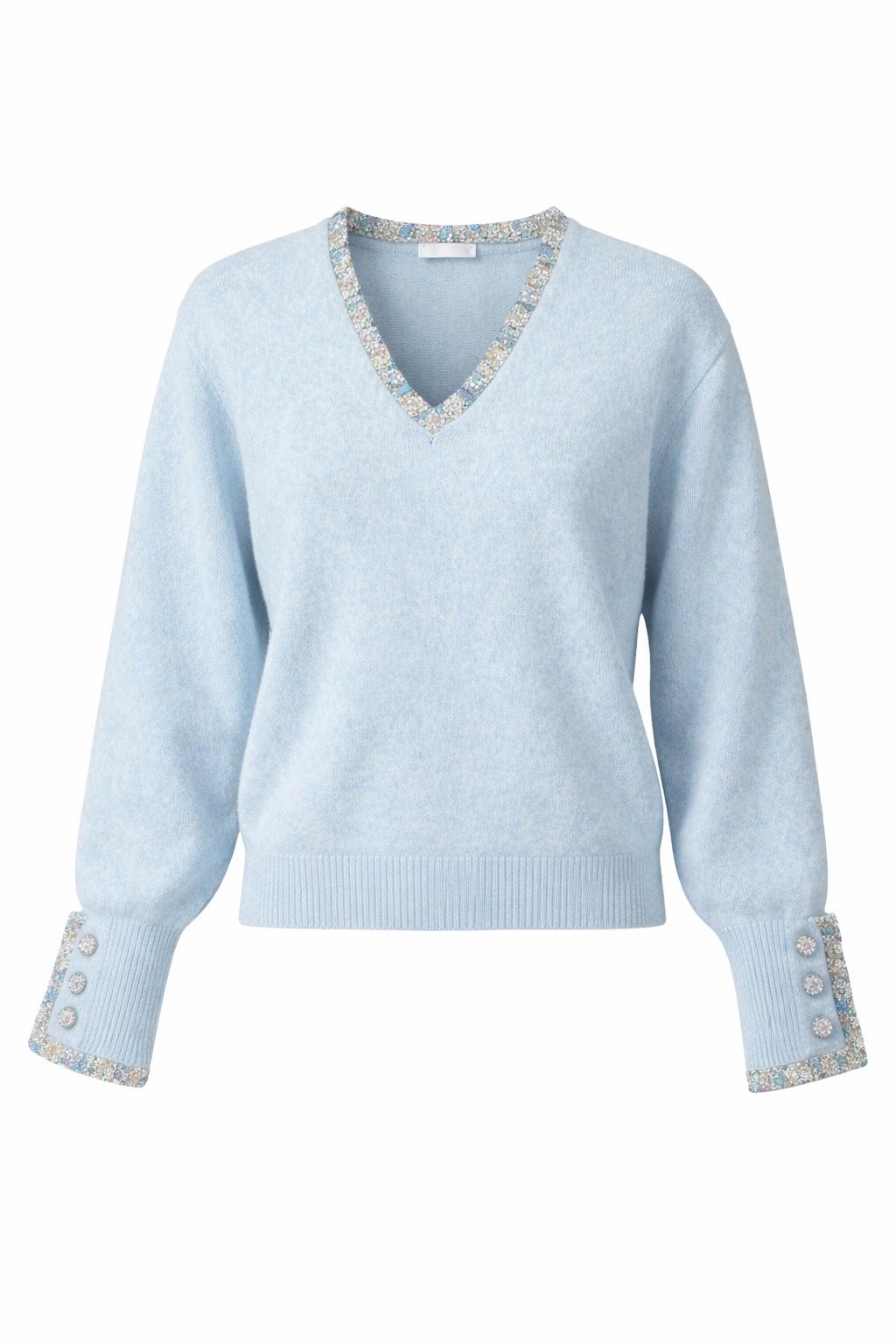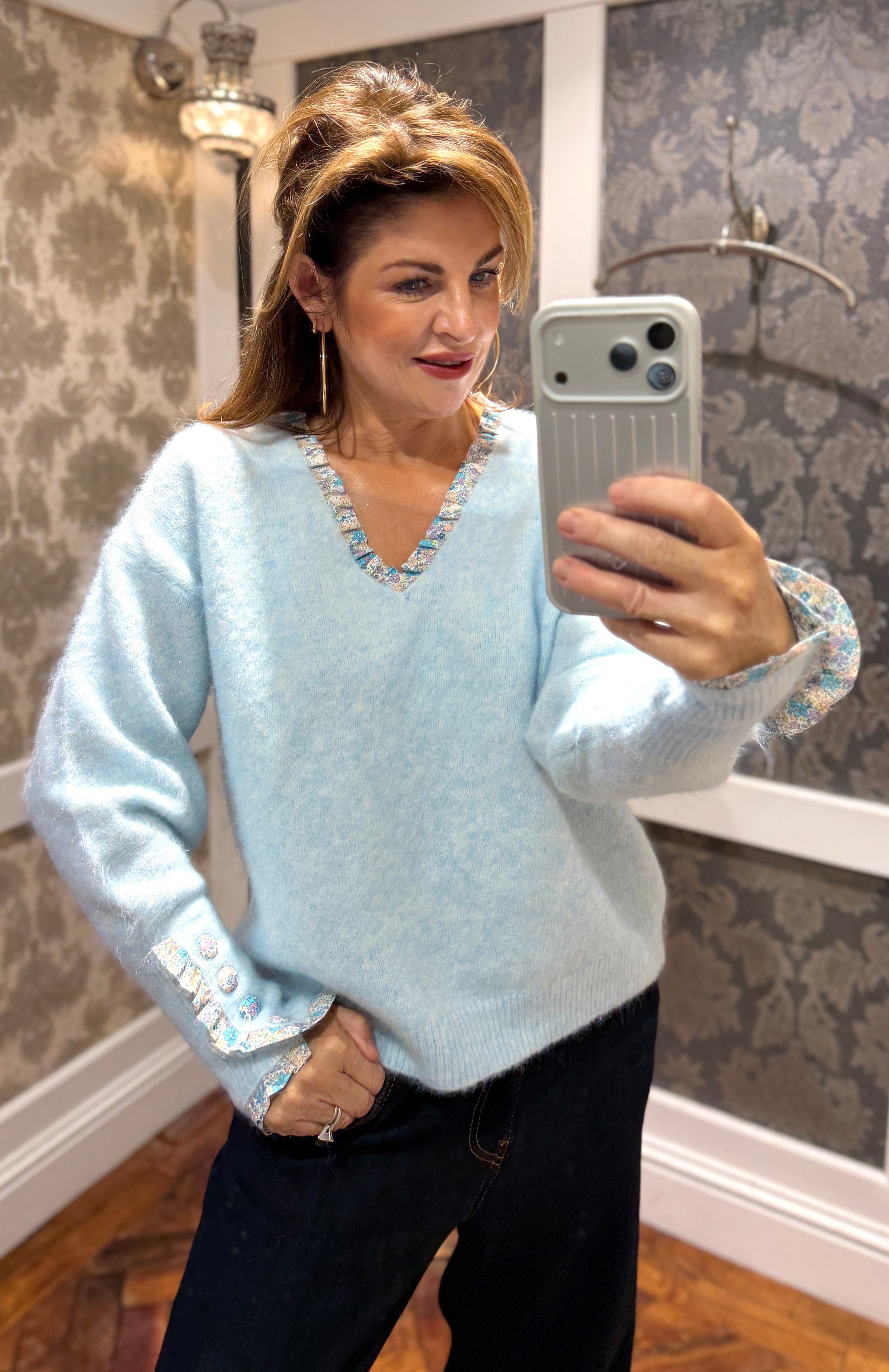 Soft, feminine, and effortlessly polished, this light blue V-neck jumper is the perfect blend of comfort and detail. It features delicate embellishment along the neckline and cuffs for a subtle touch of sparkle. The relaxed silhouette makes it easy to wear, while the refined finish elevates it beyond a basic knit. Style it with denim for everyday elegance or dress it up with tailored trousers for a chic, put-together look.