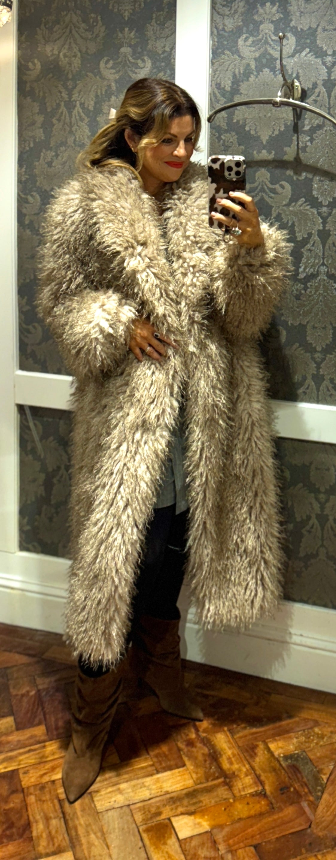 Wrap yourself in warmth and elegance with this super soft beige and hints of brown fur coat, featuring a high slouchy collar, deep pockets, a single button, and a smooth shell lining for ultimate comfort and style.