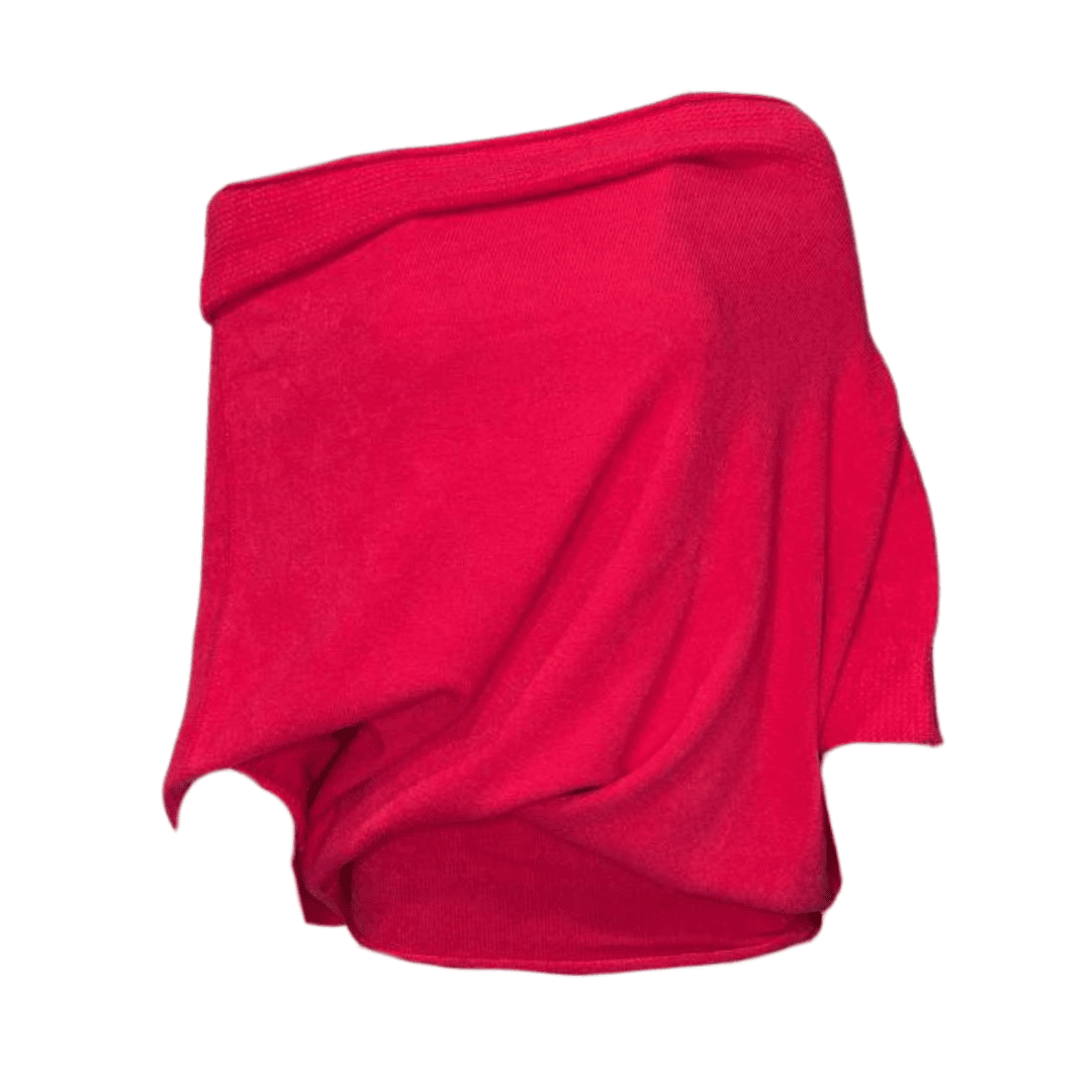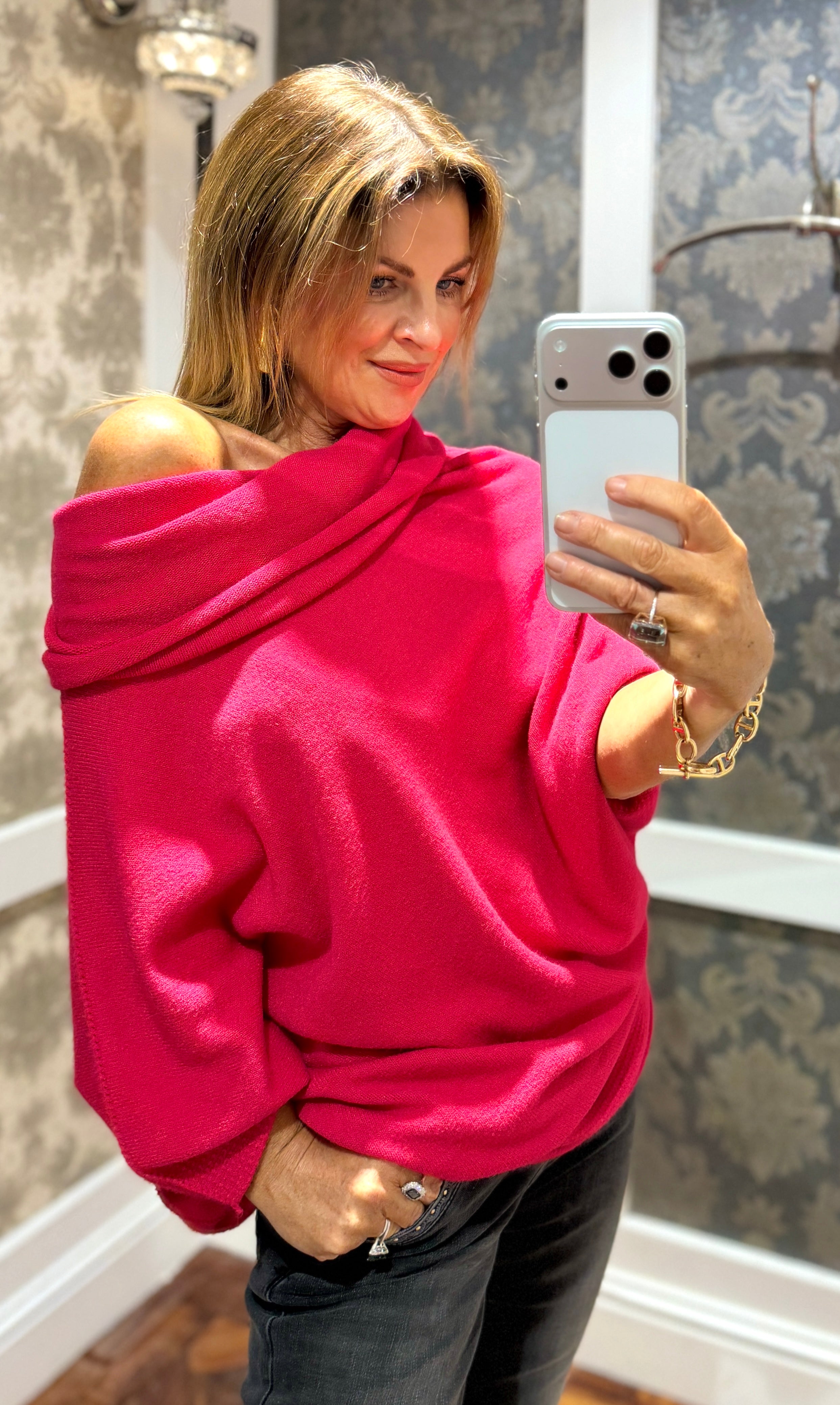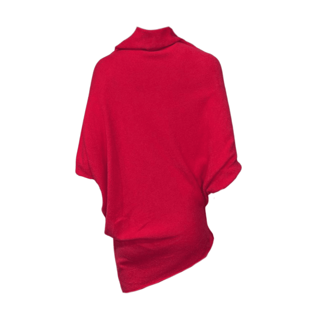 Wrap yourself in comfort and style with this super soft red knit. Designed with a slouchy, off-shoulder neckline or high neck, 3/4 length sleeve, it drapes beautifully over the body with a relaxed, oversized fit through the stomach and a more fitted shape at the hips for a super flattering silhouette. Cosy, effortless, and perfect for laid-back days or dressed-up nights. Also can be worn a variety of ways.