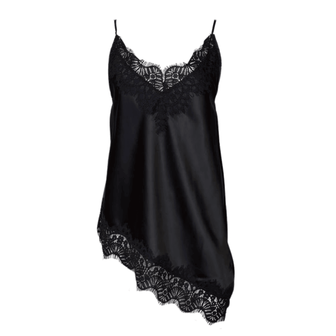 Make a subtle statement in this black asymmetrical cami, designed with a flowing silhouette and finished with delicate black lace trim. The angled hem adds movement and edge, while the soft drape keeps it effortlessly chic  perfect for layering or a sleek solo look.