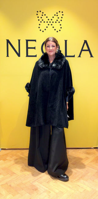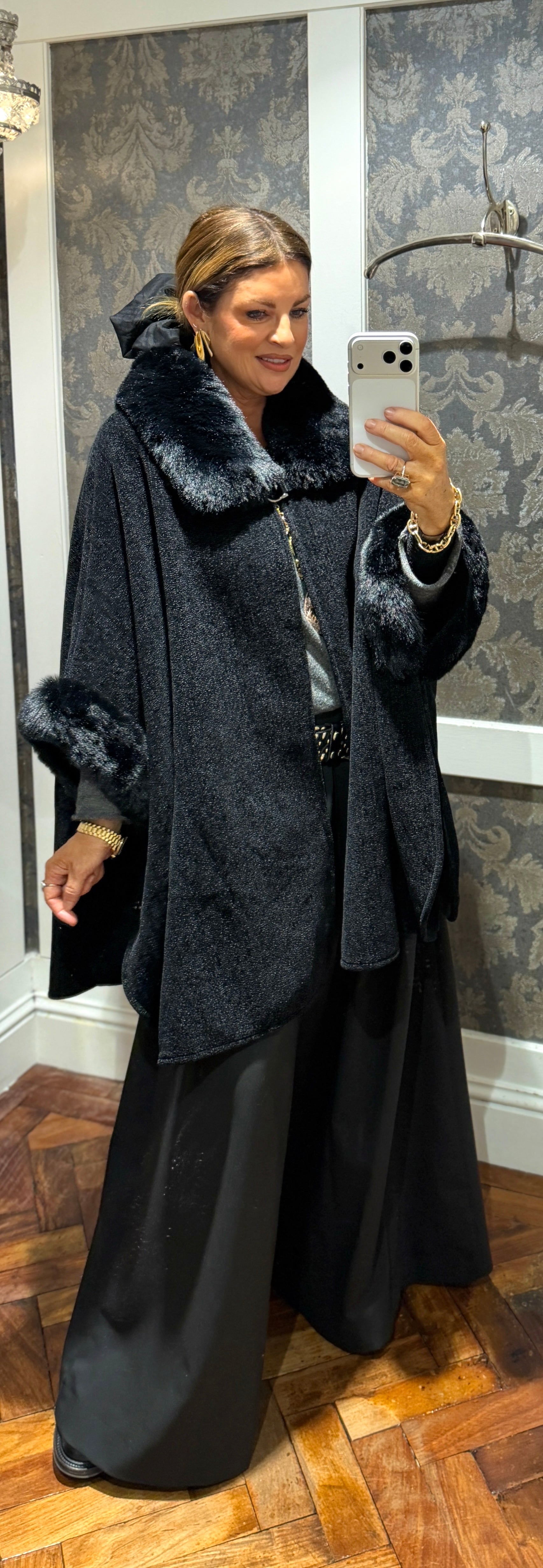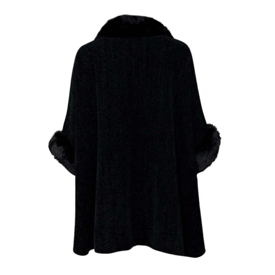 Wrap yourself in elegance with this chic black poncho-style coat, featuring luxuriously soft fur lining throughout. With a stylish fur-trimmed collar and sleeves, and a simple hook-tie closure, it offers effortless sophistication. The 3/4 length sleeves and relaxed poncho effect make it both cosy and fashion-forward—perfect for layering on chilly days.
