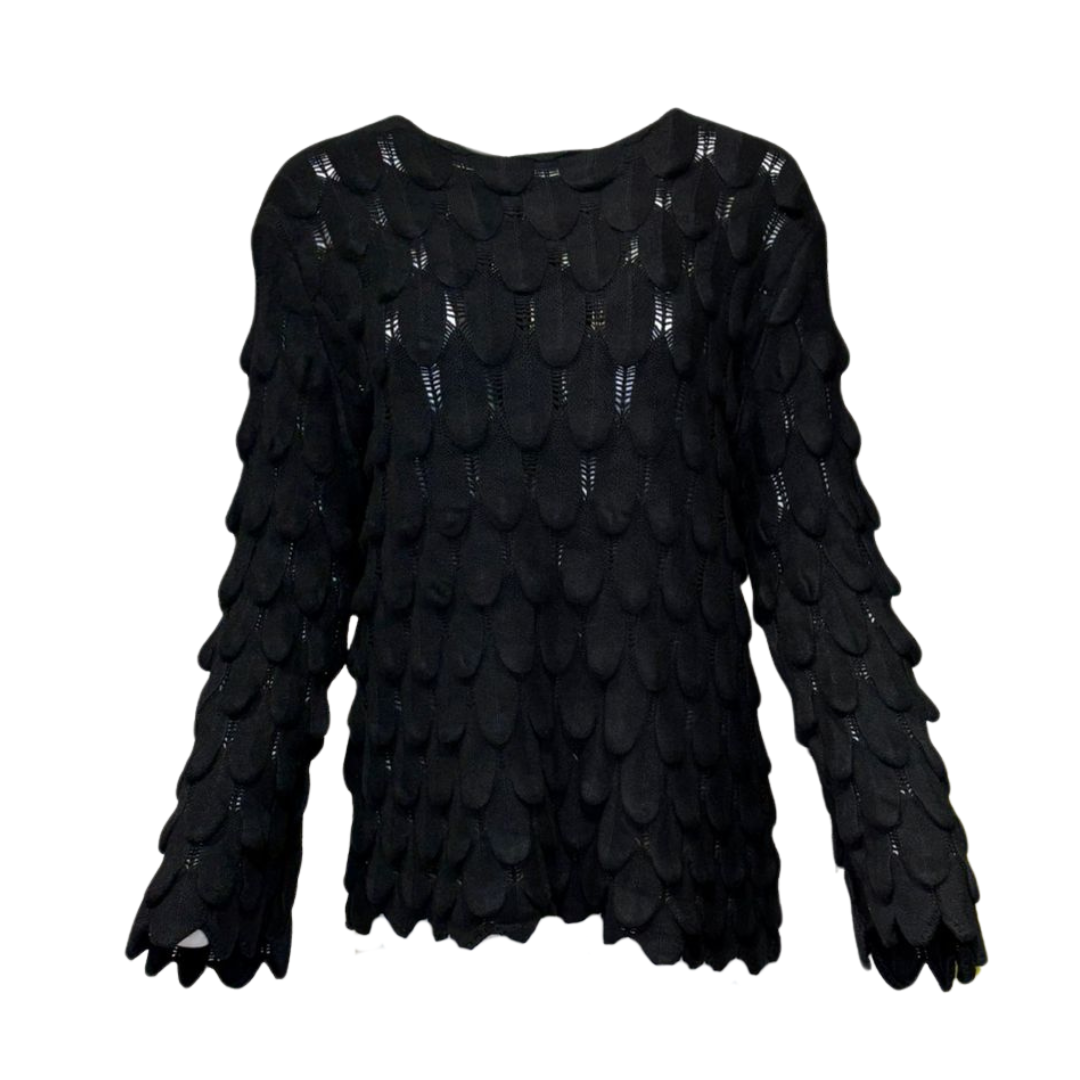 A super-chic scallop-knit jumper that’s both cozy and cool. Designed with full-length sleeves and a classic round neckline, it’s a unique pattern, comfy piece that adds effortless style to any outfit.
