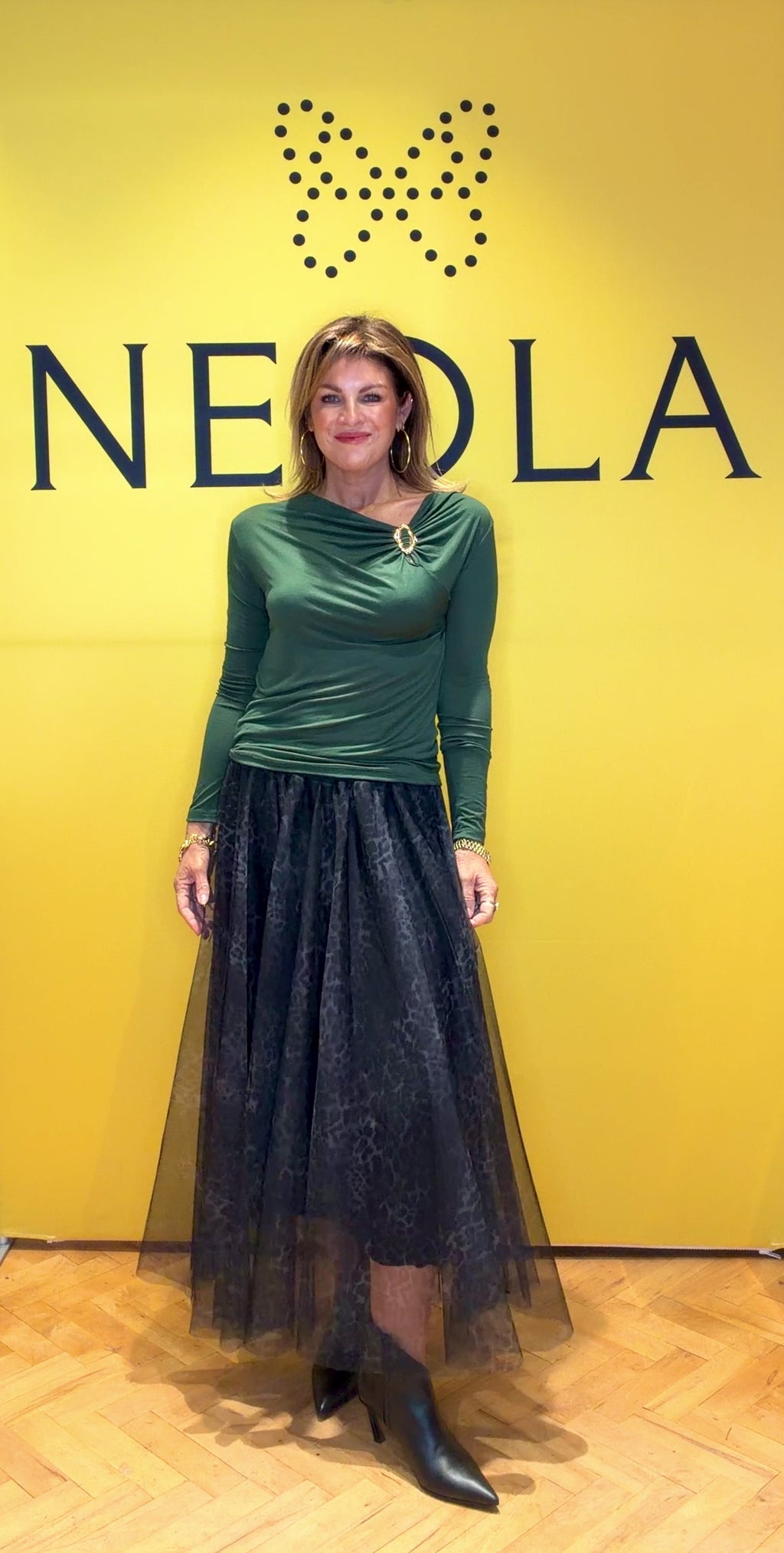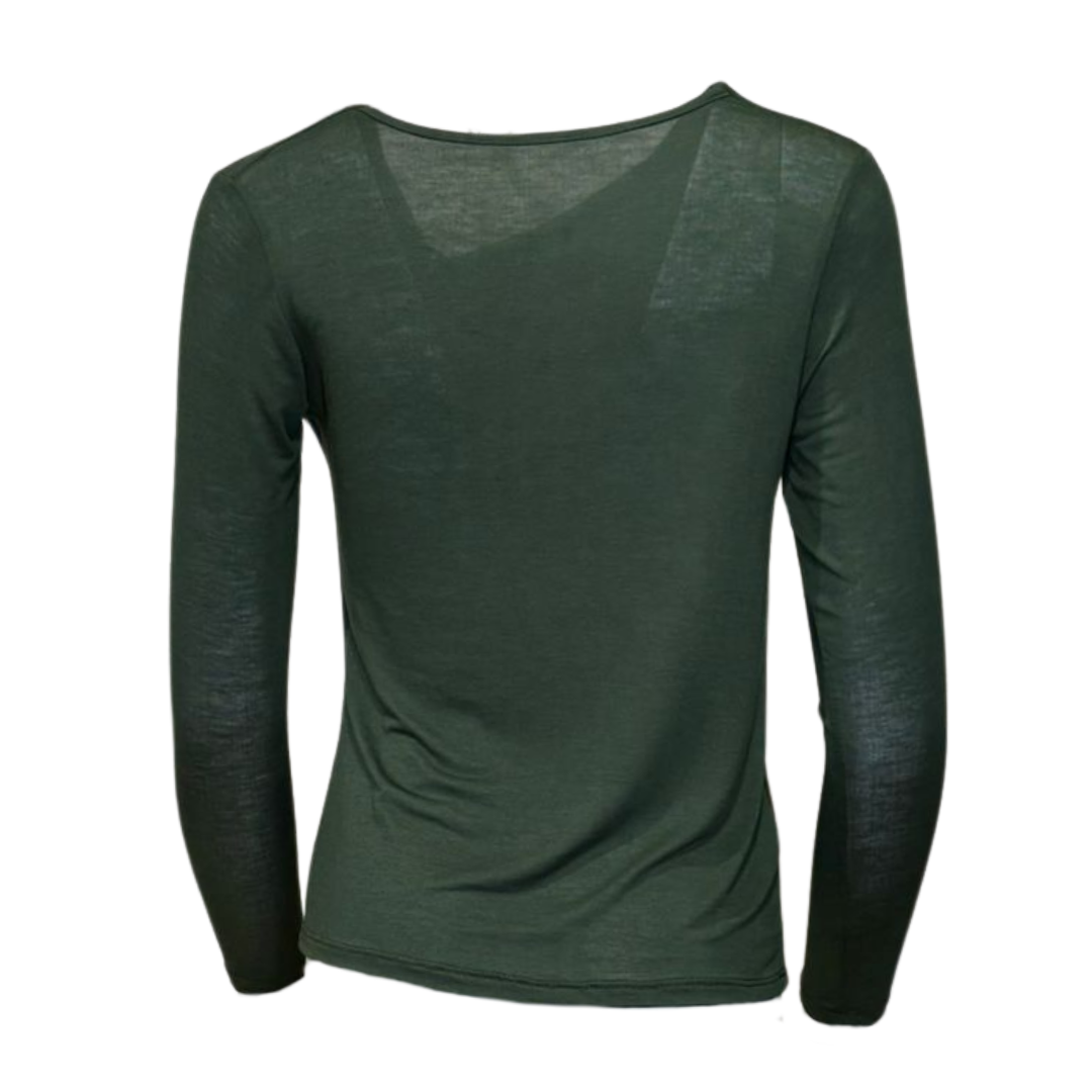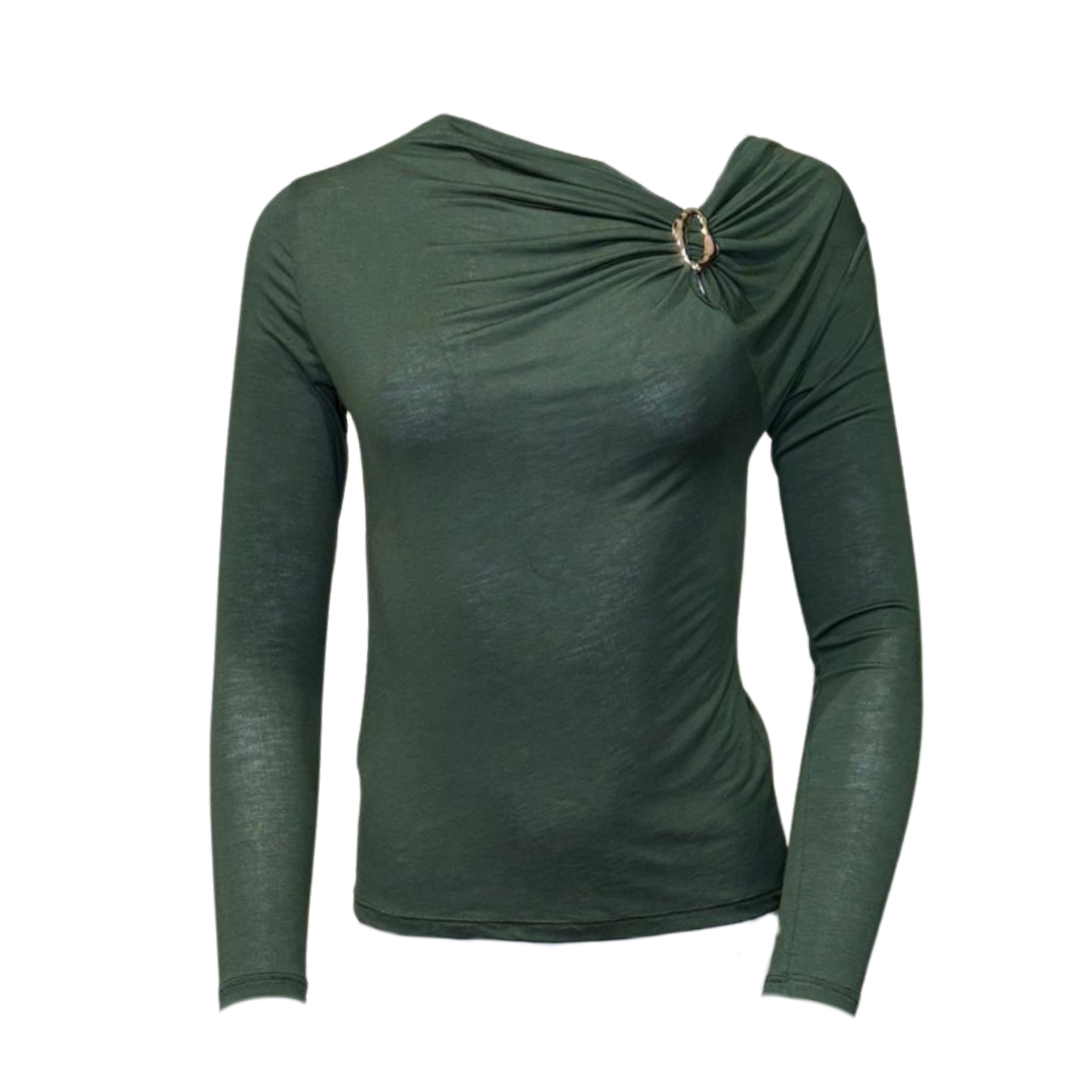 A beautifully soft lightweight wool top with long sleeves—lightweight, comfy, and perfect worn on its own or as a chic layering piece. Finished with a gorgeous gold brooch placed at the collarbone for extra flattery and standout style can dressed up or down elevate your basics!!