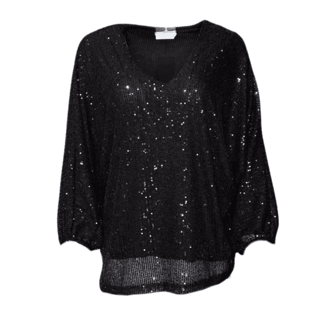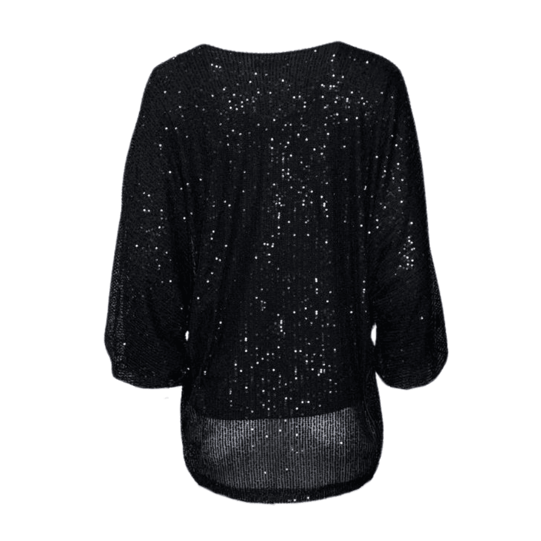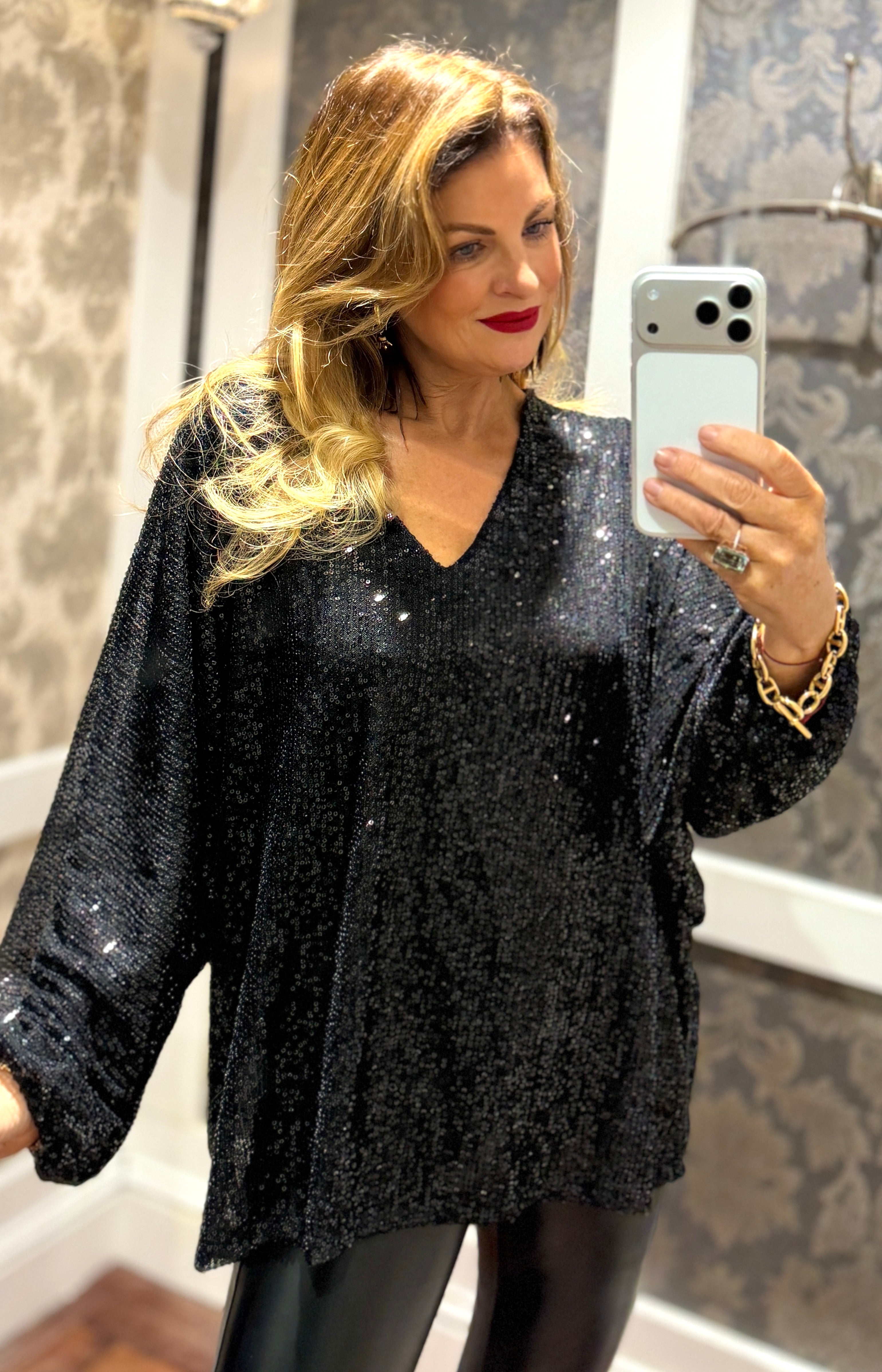 This black sequin mesh top features a flattering V-neckline, long batwing sleeves, and a free-flowing silhouette. Fully lined for comfort, it blends sparkle with softness for an effortlessly chic look.