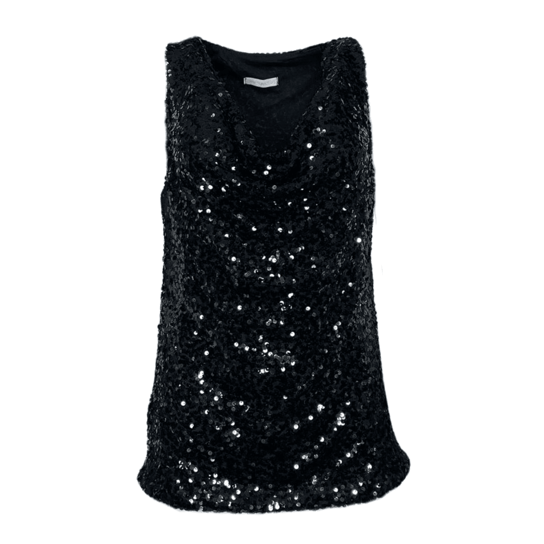 This black sequin vest top features a sleeveless design and a soft cowl neckline, fully lined in poly for a smooth, comfortable fit. Perfect for adding shimmer to any look.