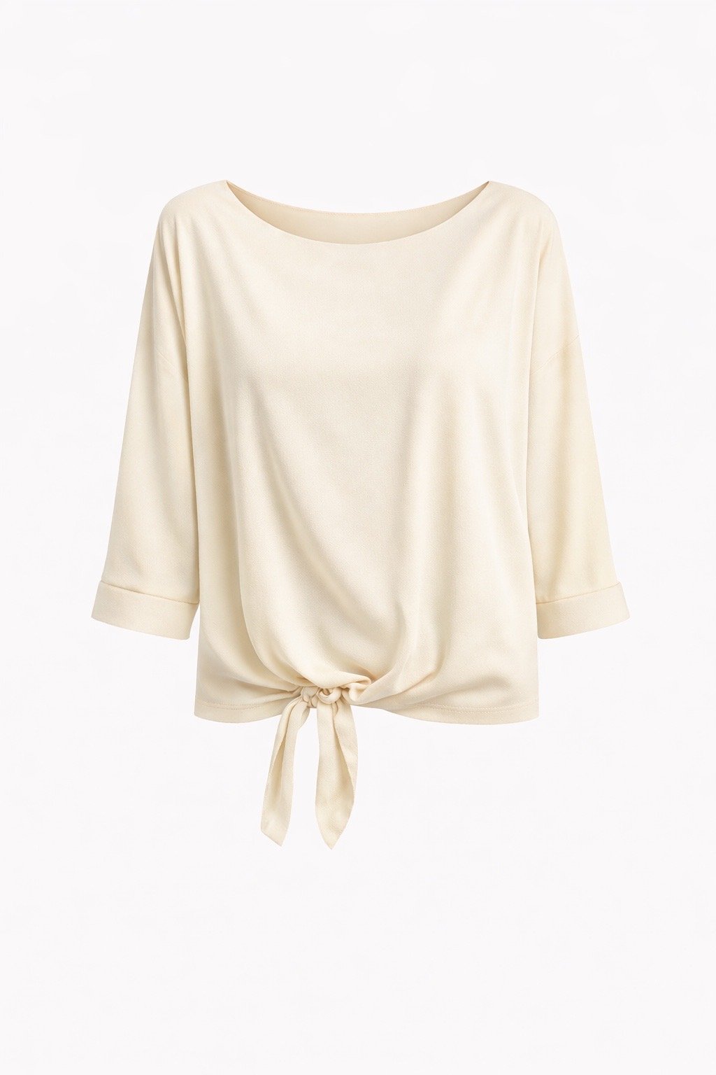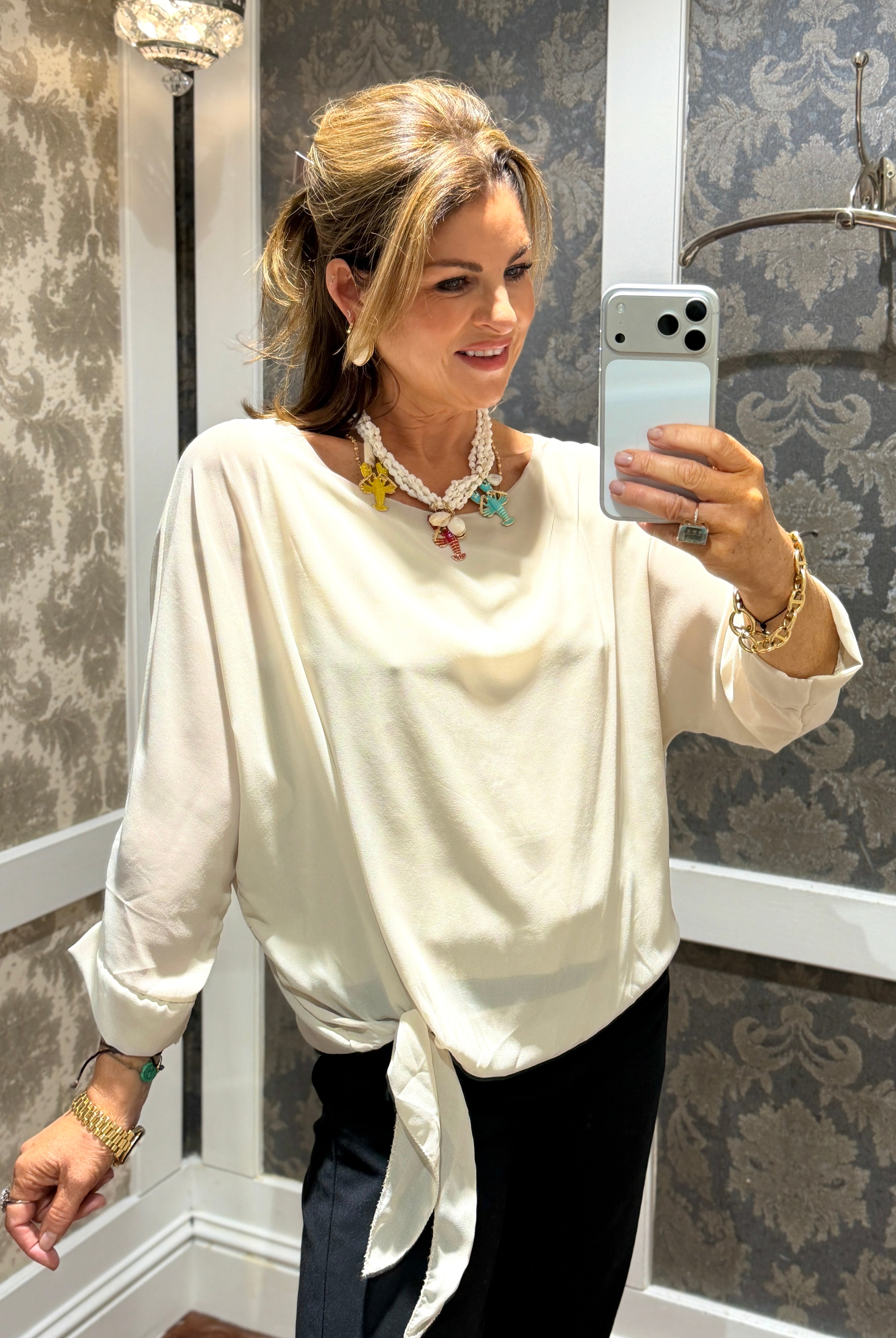 A sleek chiffon blouse with a soft drape. Designed with a boat neckline, relaxed three-quarter sleeves, and a flattering side tie detail that creates an effortless silhouette. Lightweight and smooth against the skin, this top transitions easily from day to night — perfect styled with tailored trousers or denim for a polished finish.