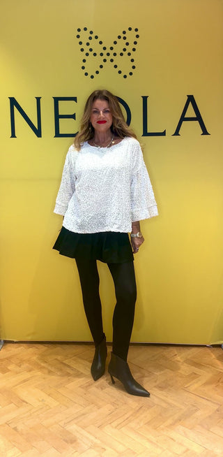 The Callie top effortlessly blends elegance and comfort, making it perfect for special events. It showcases 3/4 length sleeves with a graceful, flowing cut and subtle velvet details that provide freedom of movement while preserving a polished look. Featuring a soft polyester lining, it offers a gentle, comfortable feel on the skin without compromising on style. Whether styled with tailored pants or a fashionable skirt, Callie brings a refined, understated charm to your outfit, balancing sophistication and comfort for unforgettable occasions.