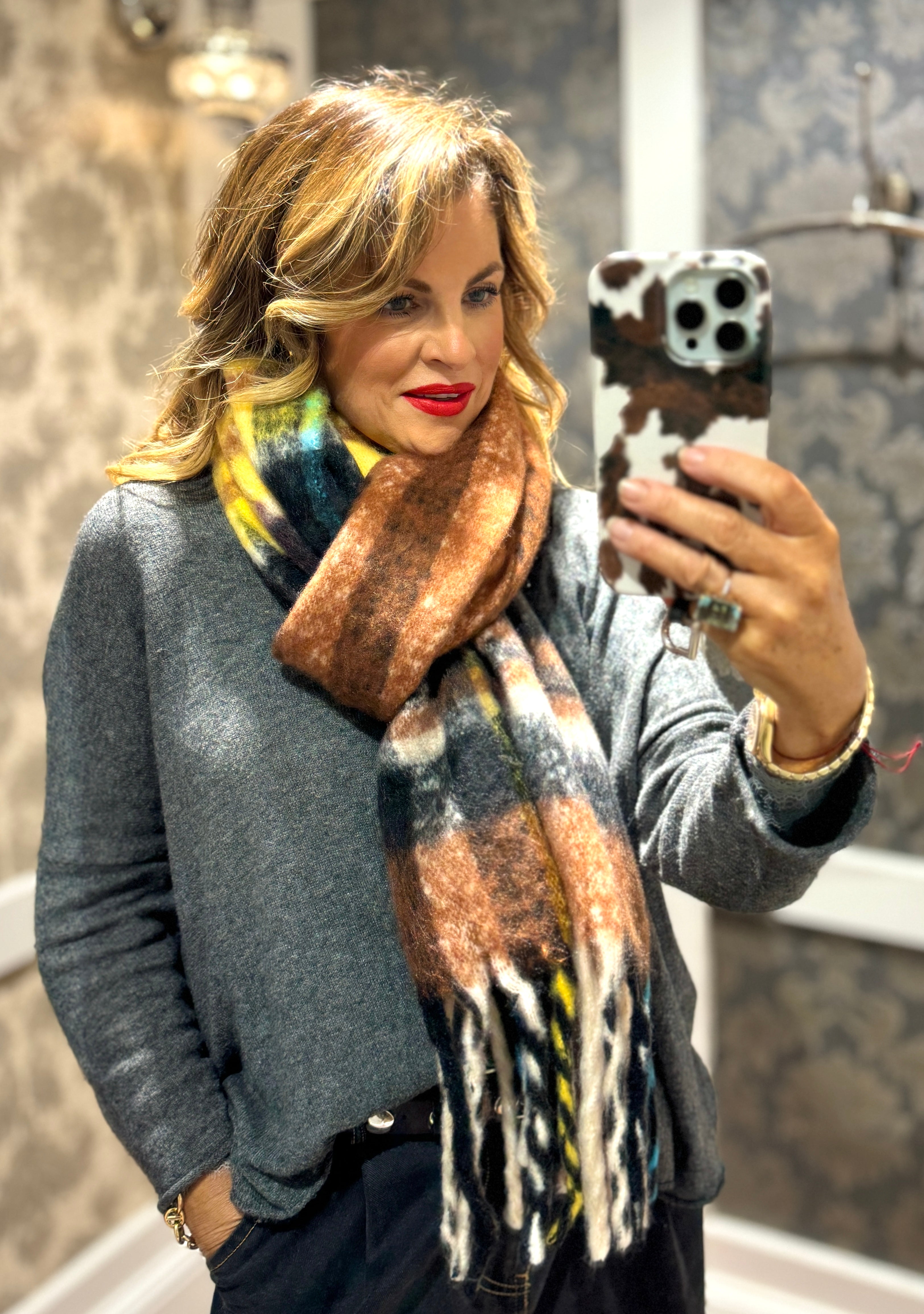 Ultimate autumnal hues of browns, reds, yellows. A thick wooly scarf, easy to throw on and keep yourself wrapped up during colder months. Beautiful shades of rich brown tones paired with blues and yellows for an extra flare of colour!