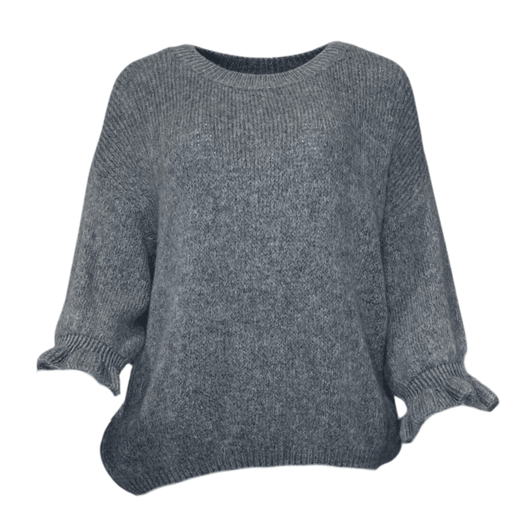 The Daisy Grey Ruffle Cuff Knit is designed to offer you both comfort and style with its soft Grey knit fabric and flattering round neckline. The 3/4 length sleeves feature gentle ruffled cuffs that add a charming touch. This sweater is perfect for layering or wearing on its own.
