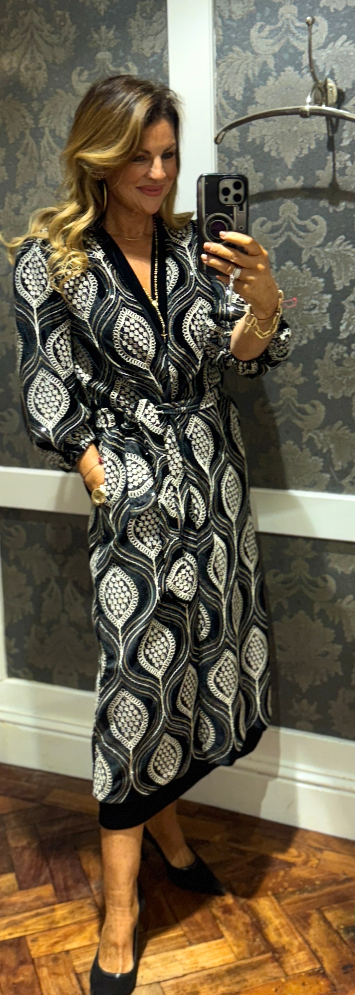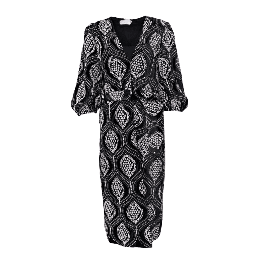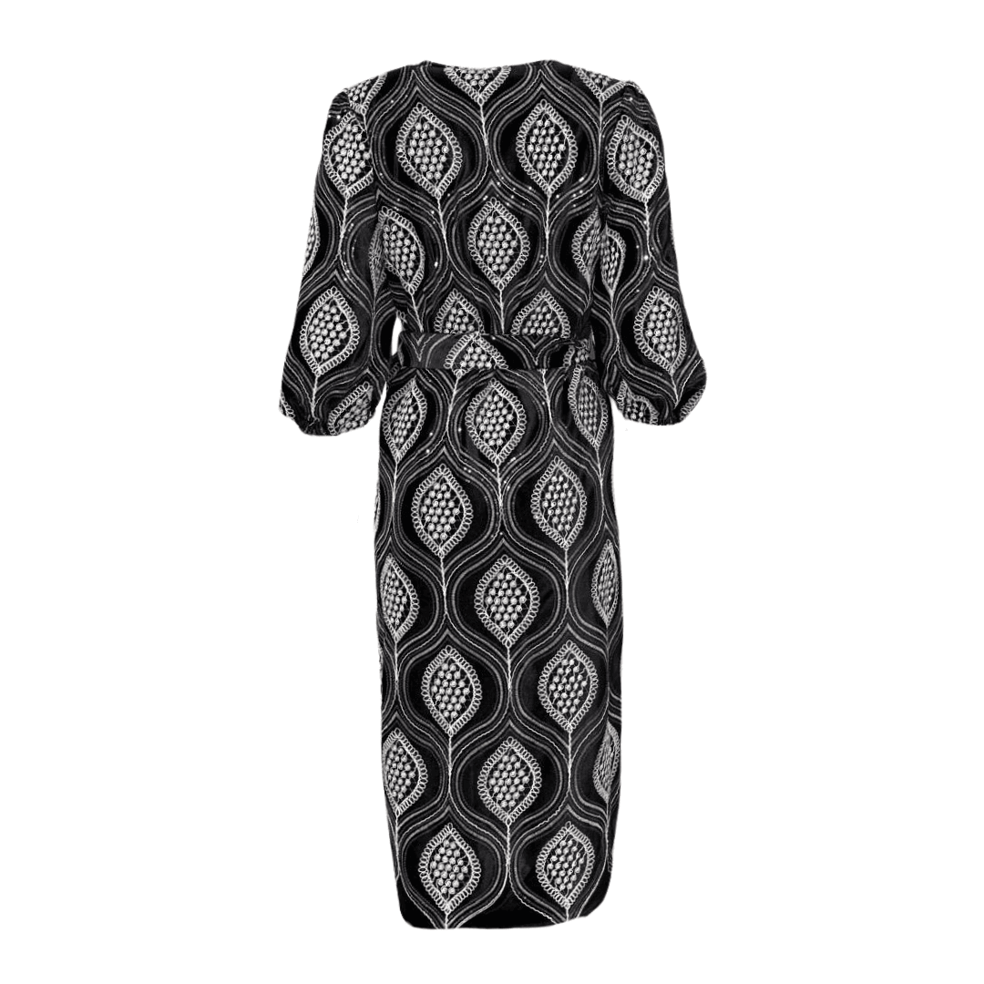Wrap around warm coat dress. Paired with puffed sleeves and a belt to tie around, creates a funky yet fashionable statement in rainy weather. A white sequin 70s inspired embroidered pattern adds flair and texture to this perfect layering piece. Made from a velvet like fabric.