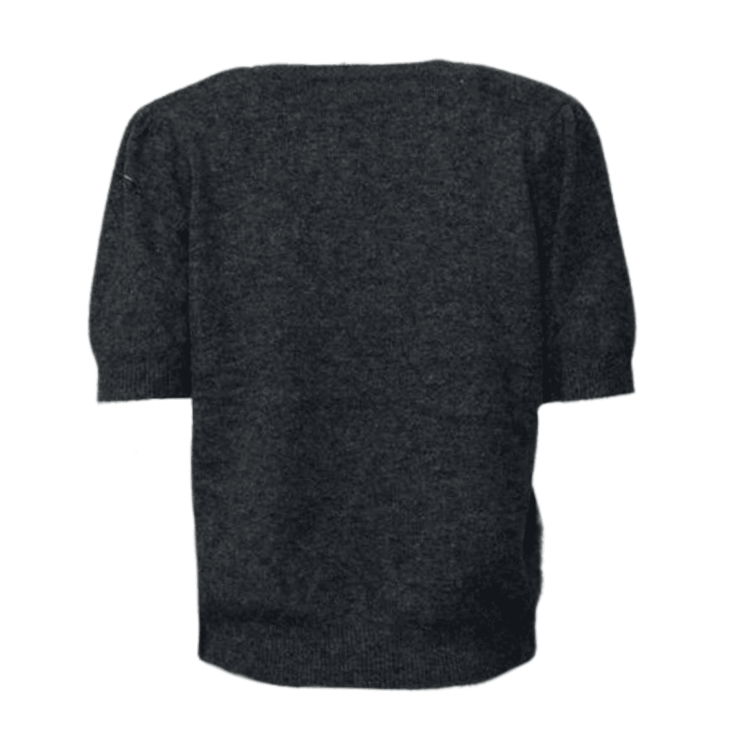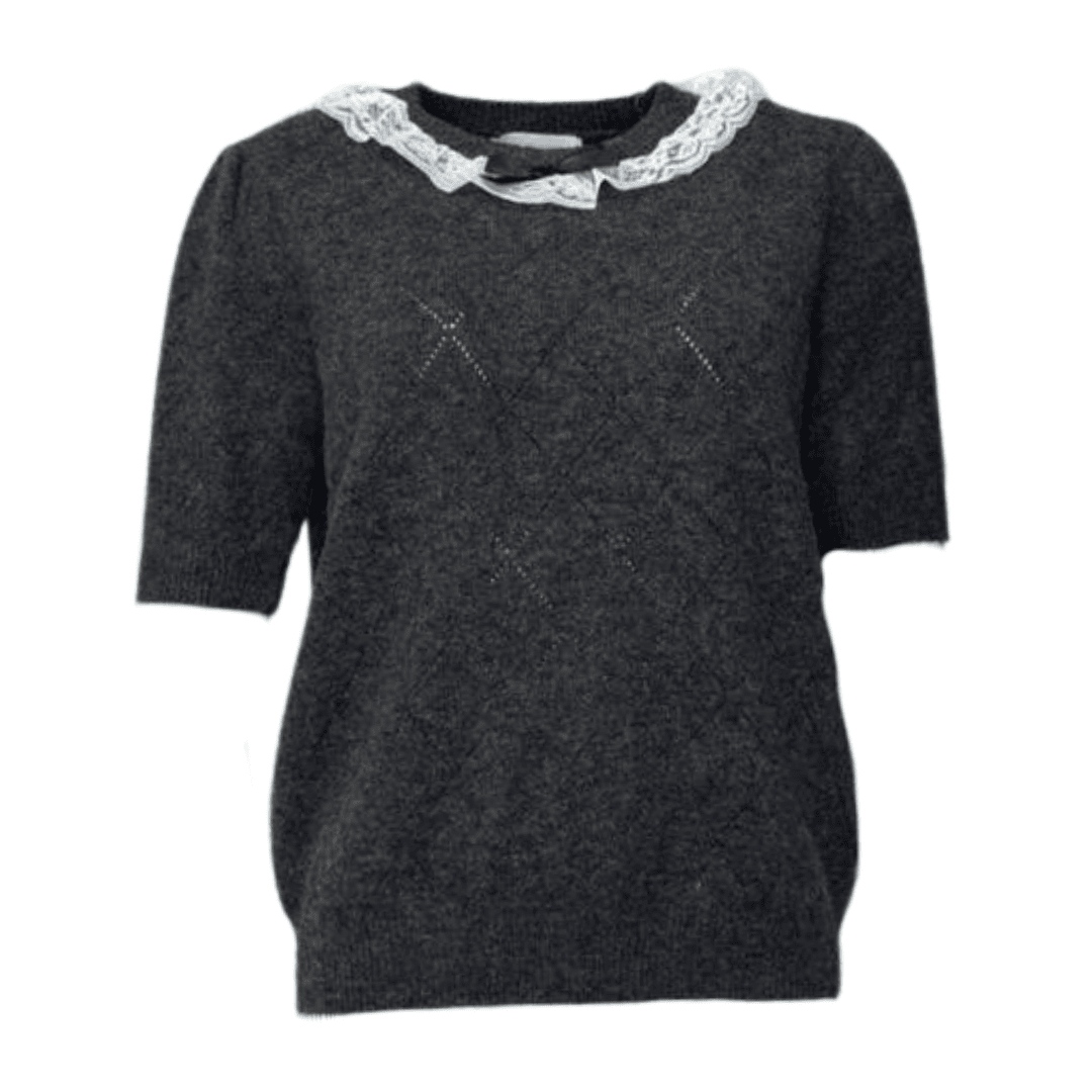 A cute little knit to add a feminine touch to any outfit this winter. Short sleeves with a loose fit to accentuate shape.  Diamond rib pattern throughout the grey knit, with a gorgeous white frilly lace on the collar, adorned with a black ribbon bow.