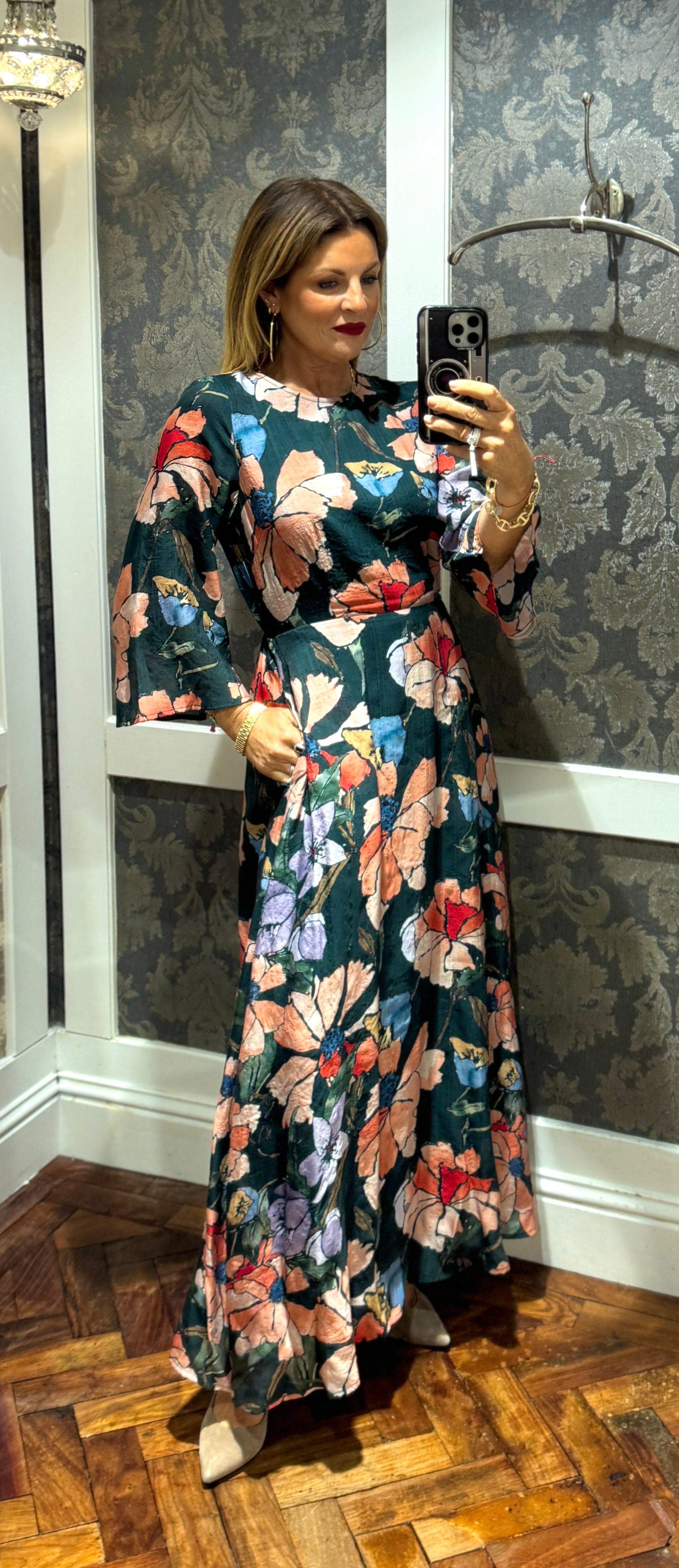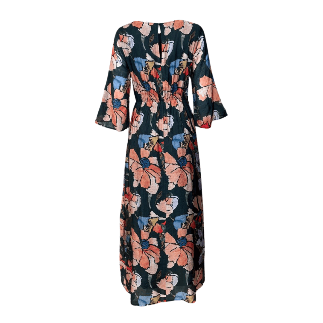 This easy to wear dress features a graceful maxi length with long sleeves, designed to flatter with an elasticated waist for a tailored fit. The button closure at the back enhances ease of wear. Beautiful artsy watercolour flowers all over, in shades of blue and pink. The perfect pop of colour to enhance this forrest green dress.