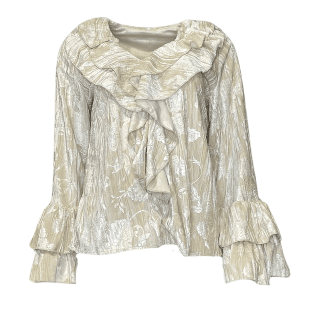 The Monaca Blouse in Ivory elegantly combines delicate frills with softly elasticated puff sleeves, crafting a look that is both refined and contemporary. Its subtle, understated floral pattern lends a touch of vintage charm to the creamy ivory fabric, resulting in a beautifully balanced design that radiates timeless style and grace. Versatile and sophisticated, this blouse is perfect for elevating your outfit whether you're attending an evening event or bringing polished style to the office. Experience a piece that effortlessly blends classic beauty with modern refinement.