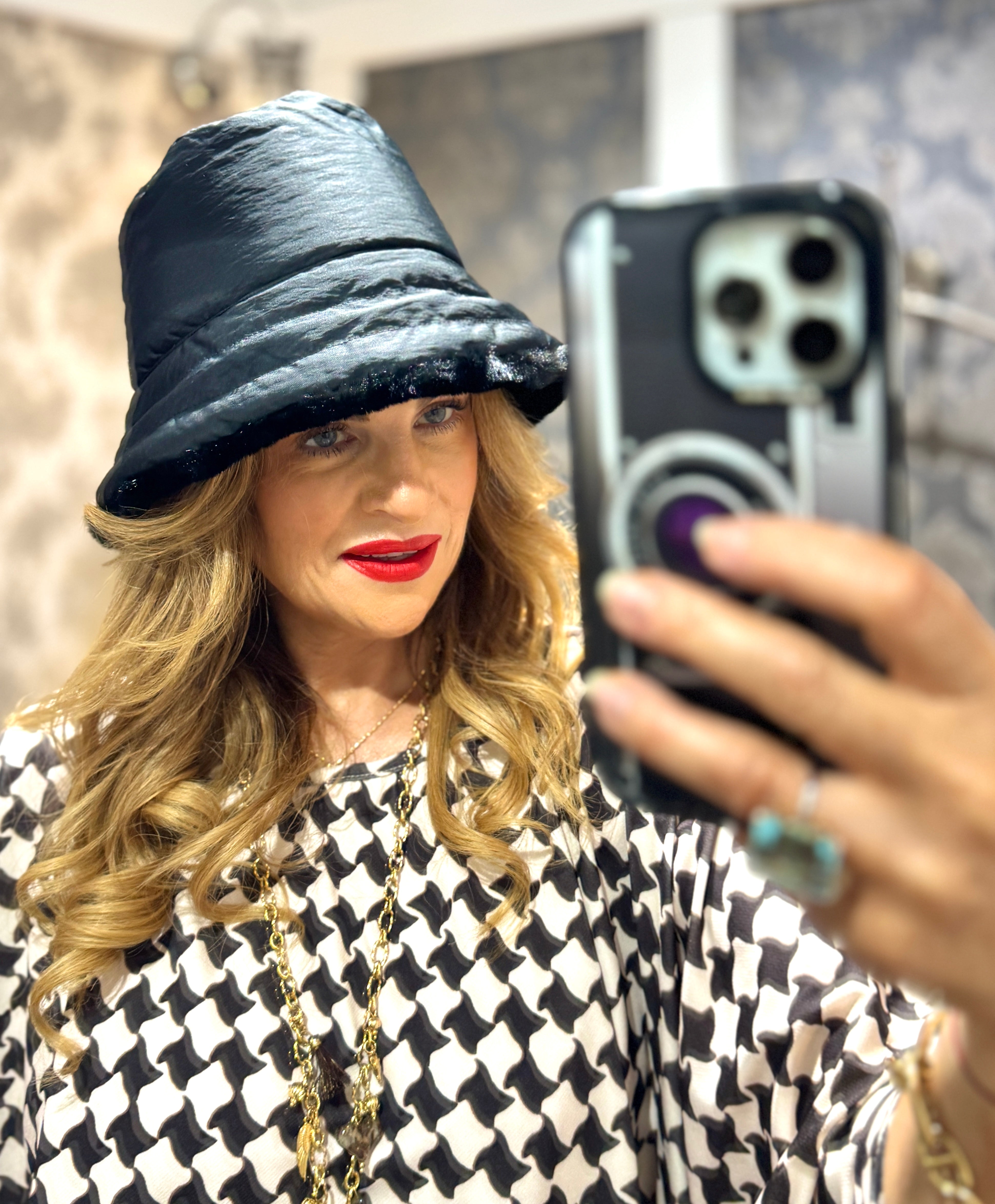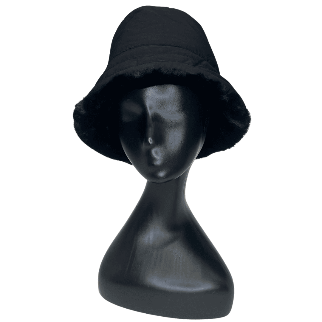 This versatile black Derhy bucket hat offers two stylish looks in one, featuring a reversible design with a plush, fluffy side and a sleek satin-like side. Ideal for transitioning into the colder months, it adds a sophisticated touch to your winter wardrobe. Available also in white, this hat is a must-have accessory to enhance your outfit with both comfort and style.