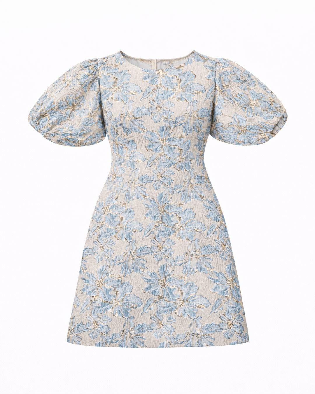 A beautifully tailored knee-length dress crafted in a soft floral jacquard with subtle metallic thread running throughout for a gentle shimmer. Designed with statement puff sleeves and a flattering fitted waist, it features a removable tie belt that can be styled at the front or back for versatile wear. Finished with a clean round neckline and a smooth, structured silhouette, this piece is perfect for occasions where effortless femininity meets understated sparkle.-see reel for more information