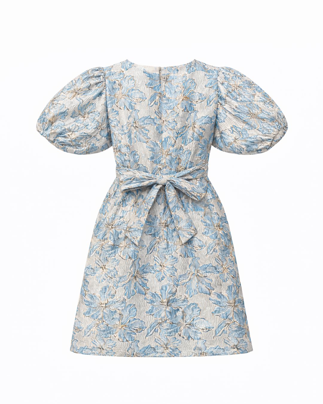 Eliza Blue Floral Metallic Jacquard Dress Reversible Bow