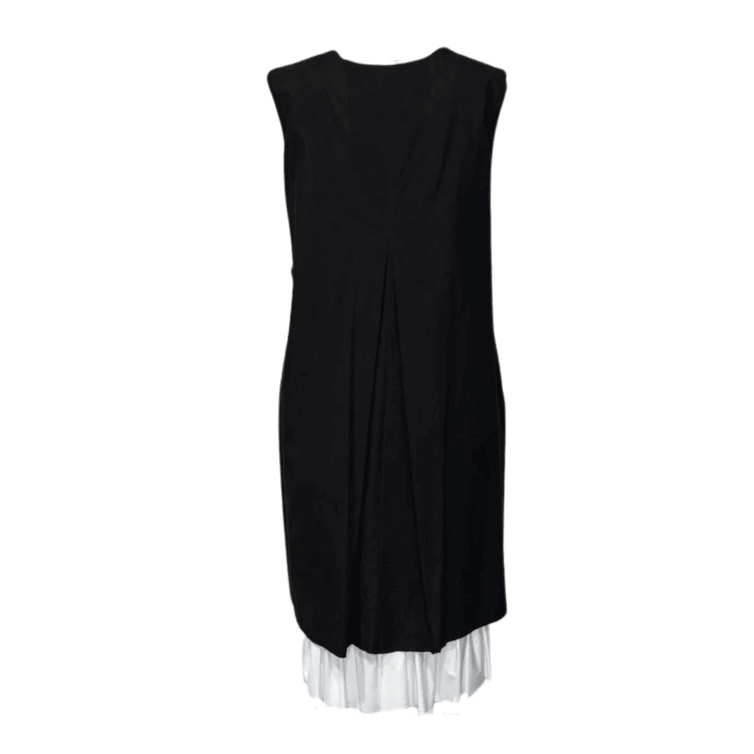 Add a touch of edge with this tailored raw-cut dress, featuring bold white and black lining, a clean white trim, and a sleeveless V-neck design with pockets on either side. Its structured yet quirky silhouette makes it a standout layering piece—perfect over shirts, turtlenecks, or on its own for a statement look .