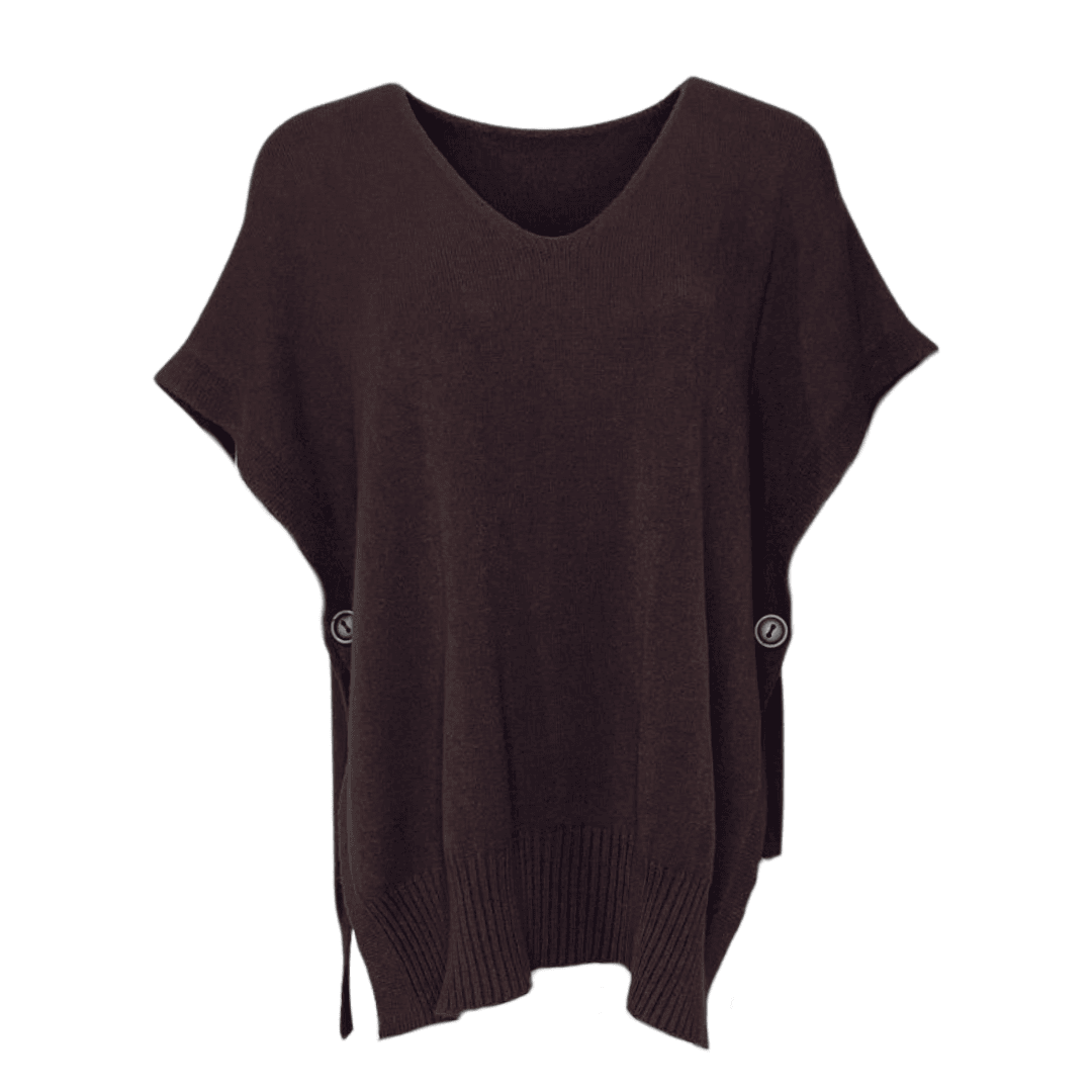 Stay comfortable and stylish in this super soft, stretchy rich brown poncho, featuring a flattering V-neck and short sleeves. Side button closures allow you to wear it open and loose or slightly structured for added shape. An easy layering piece with a relaxed, versatile fit—perfect for any season.
