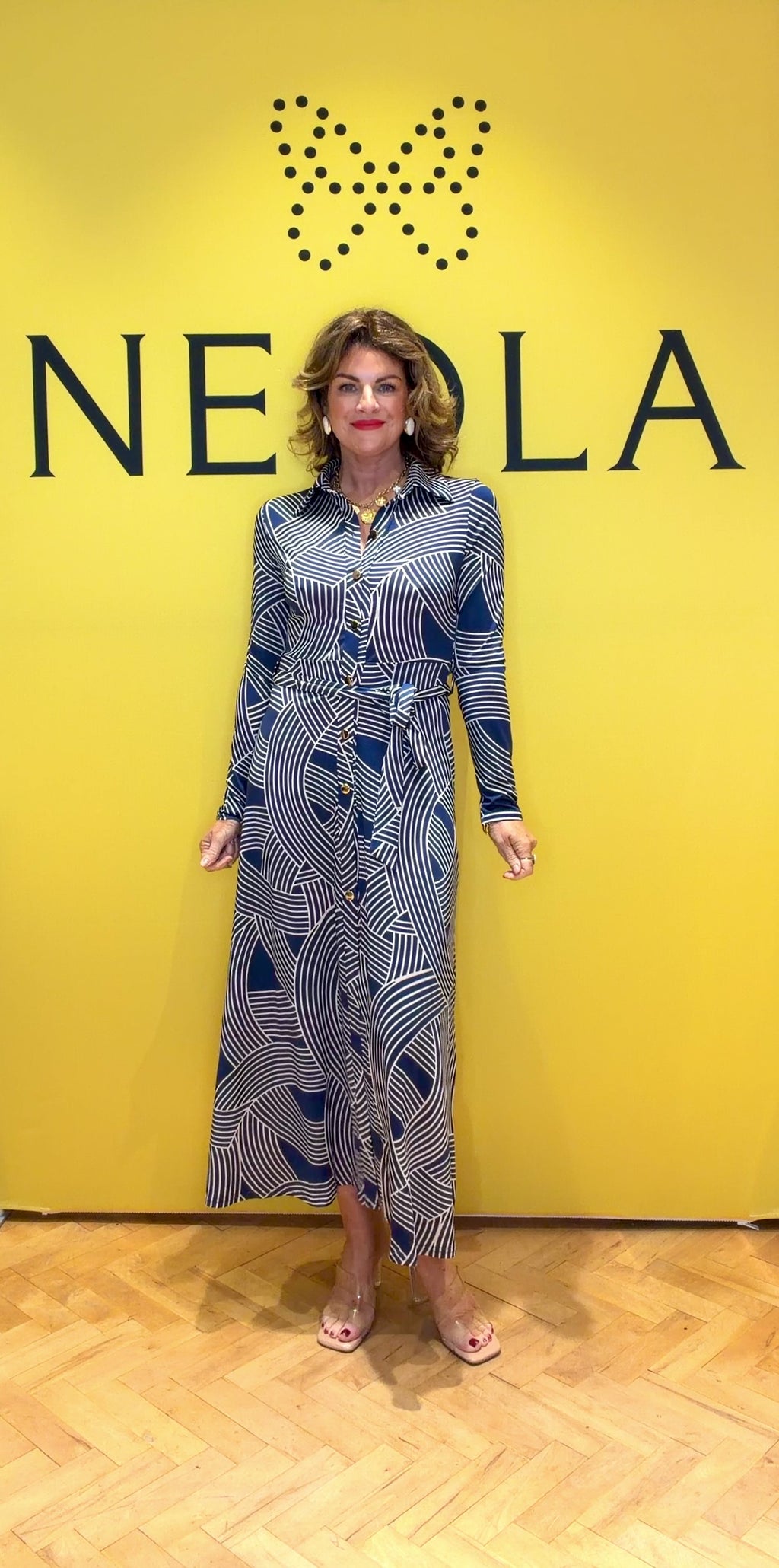 The Noa, Shirt Dress is a timeless maxi silhouette with a modern edge. Designed in a deep navy blue base with a striking white geometric print, it features a classic collared neckline, button-through front, and long sleeves for effortless wear. The self-tie waist cinches the shape beautifully while the fluid skirt creates an elegant, elongating line. Easy to dress up or down, this is a versatile piece that works season after season.