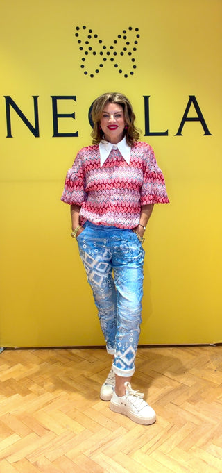 A statement blouse with a playful retro-inspired print in vibrant pink tones. Designed with a crisp white collar and soft puff sleeves, it offers a flattering, slightly relaxed fit that’s easy to style with jeans or tailored trousers. Lightweight and comfortable, this standout piece adds instant personality to any outfit.