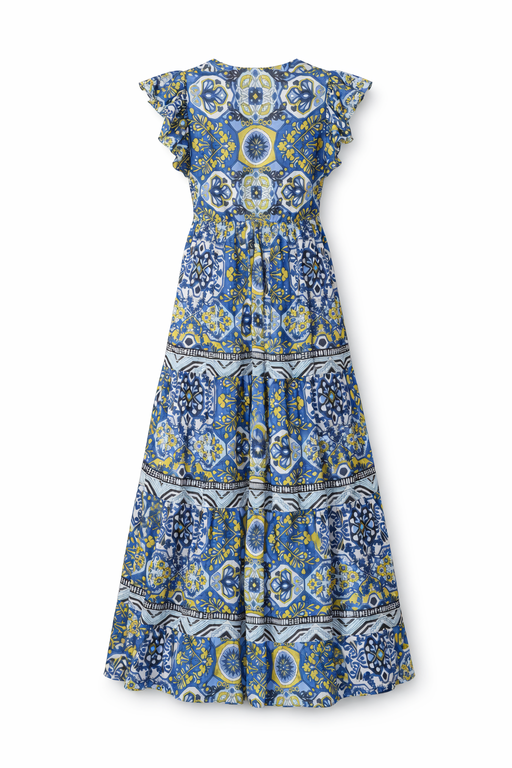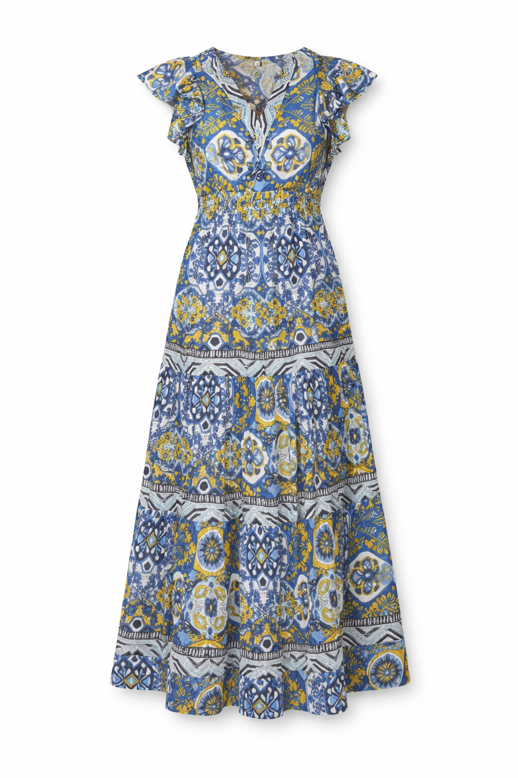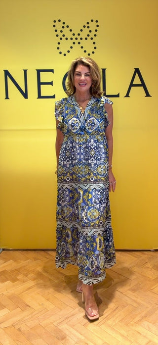 Blue & yellow printed maxi dress by René Derhy, featuring a flattering fitted waist, soft flutter sleeves, and a flowing tiered skirt. Lightweight and easy to wear, it’s perfect for summer days, holidays, or dressing up with sandals for an effortless chic look.