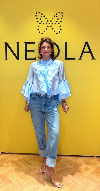 The Cloud Ruffle Blouse is a dreamy statement piece with an effortless, floaty feel. Designed in a soft blue tone with ruffles through the front and dramatic sleeves, it brings instant style. The relaxed, one-size fit comfortably suits a UK 8–16. Light, airy and easy to wear, it looks just as good styled casually with denim as it does dressed up for dinners or occasions.