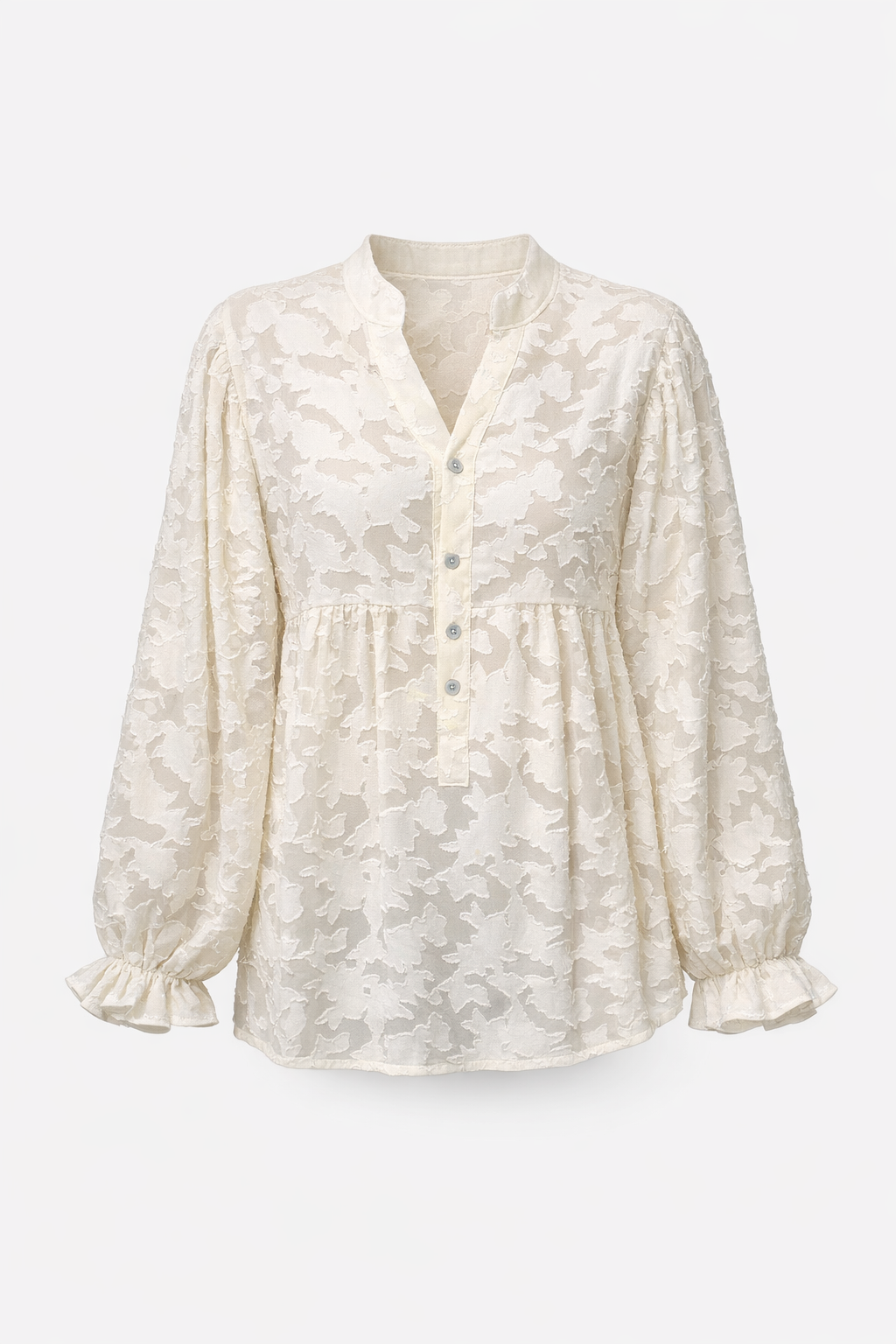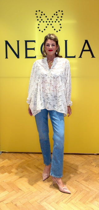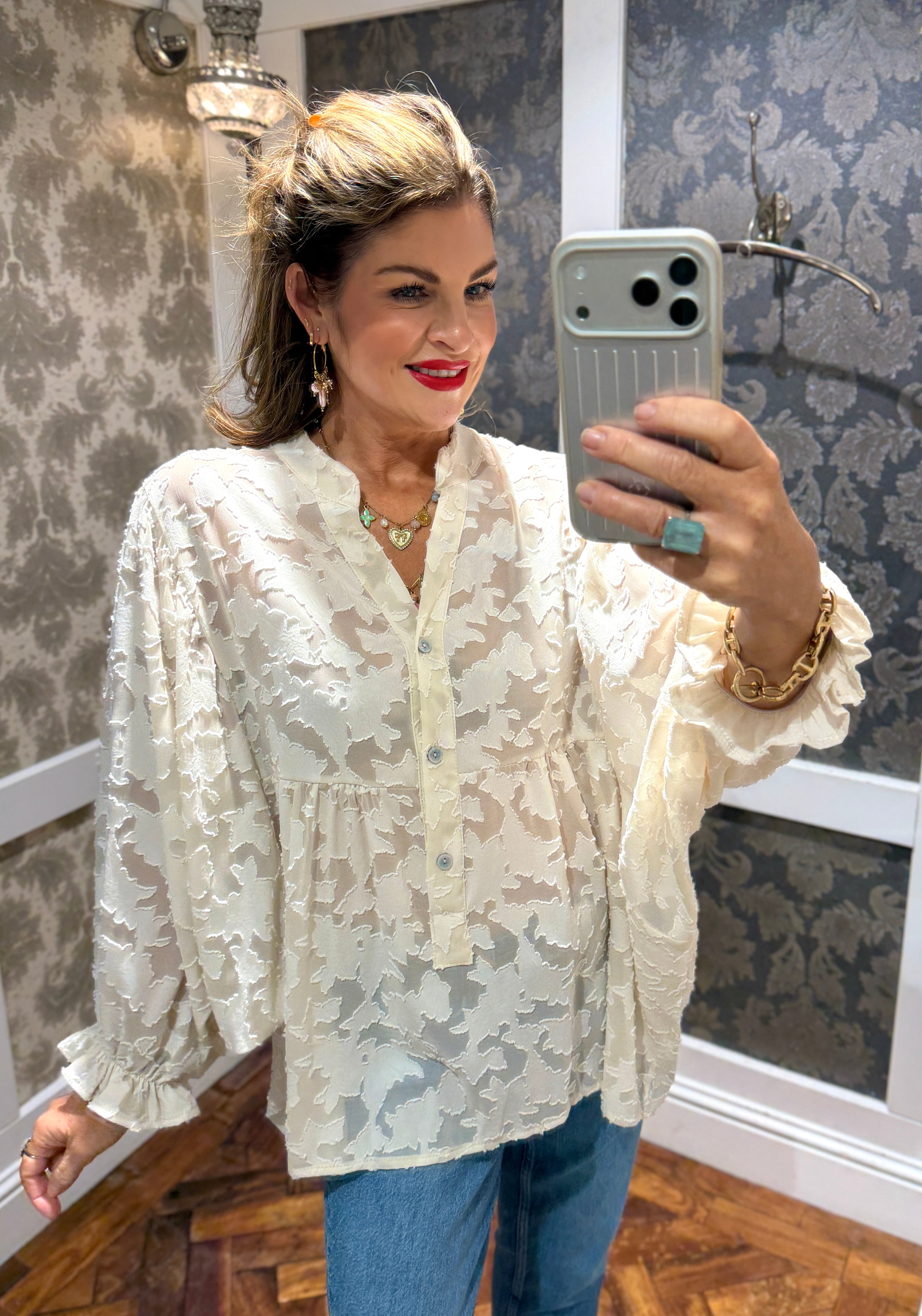 A beautifully soft cream lace blouse designed with a relaxed, floaty silhouette and delicate textured floral fabric. Featuring a flattering V-neck with button detail, voluminous sleeves with gentle ruffle cuffs, and a lightweight semi-sheer finish. Effortlessly elegant, it pairs perfectly with jeans for everyday chic or dressed up for evening styling.