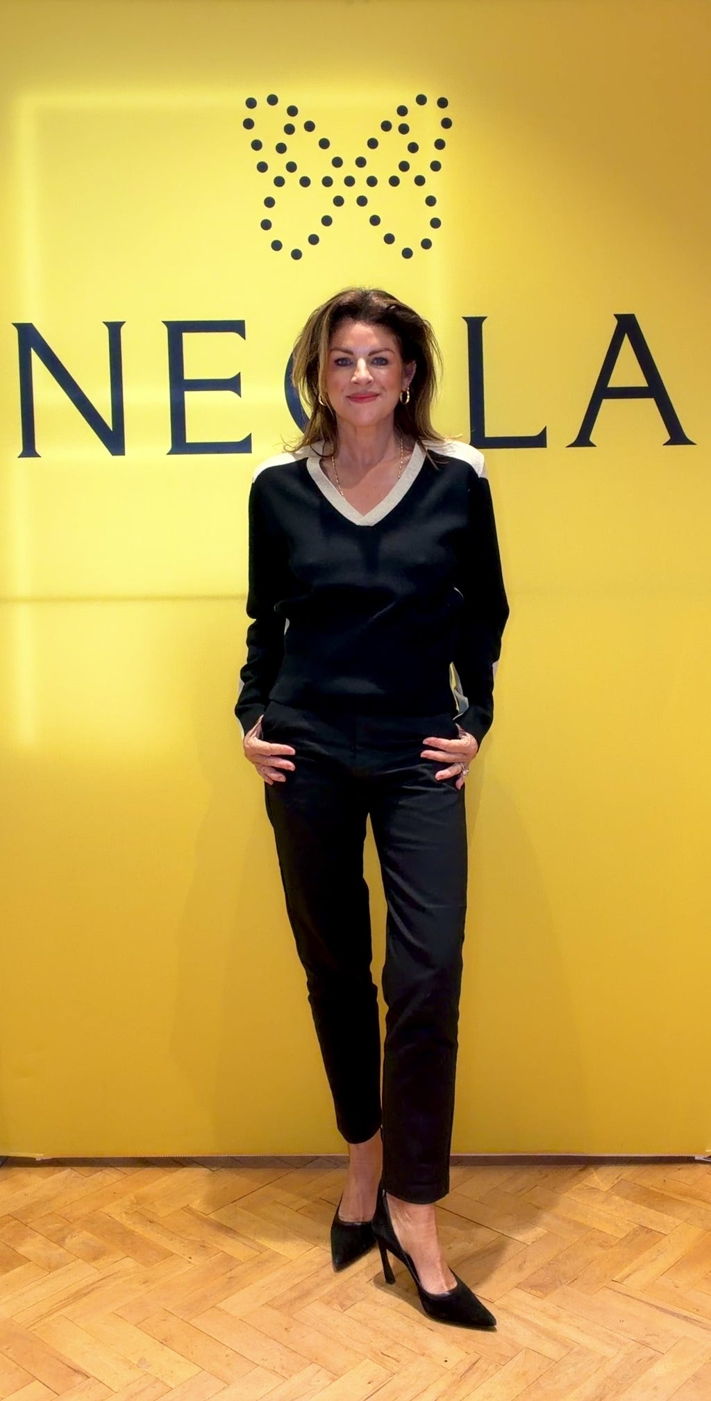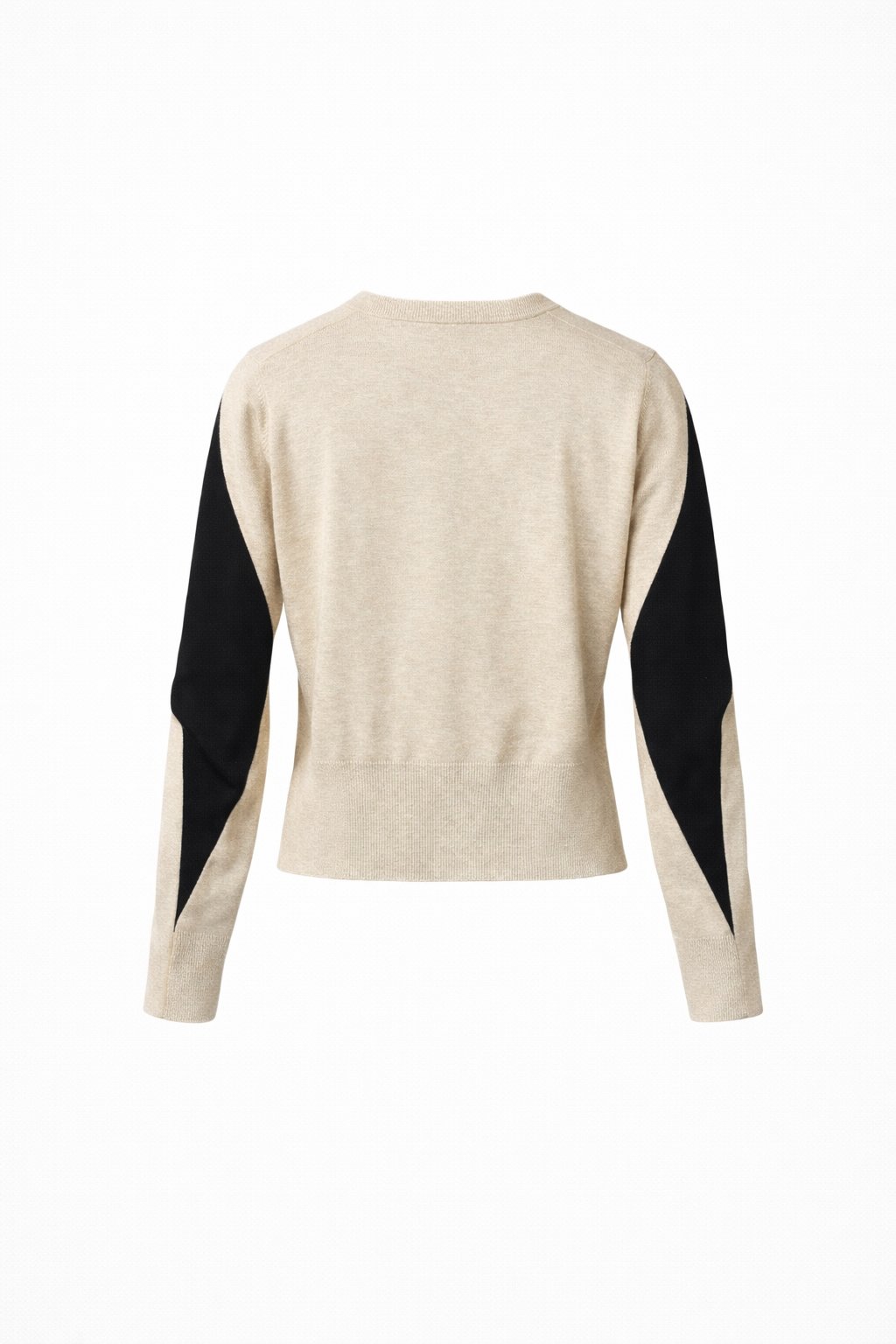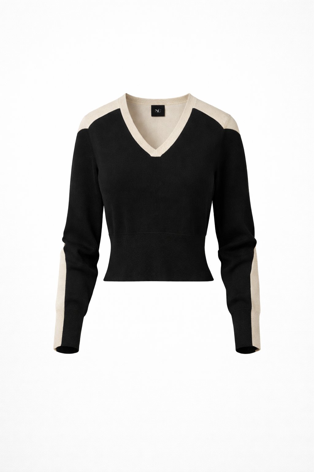 A sleek Nu Denmark, modern knit designed for effortless everyday wear. This cropped V-neck jumper features a flattering black body contrasted with soft, warm beige panels for a refined colour-block finish. Crafted in a smooth, lightweight knit with a clean silhouette, it’s perfect for layering or styling solo. Easy to dress up or down, this piece brings a polished edge to casual outfits while remaining comfortable and versatile.