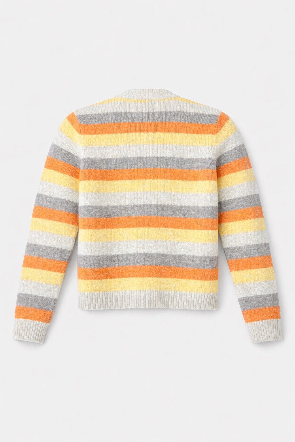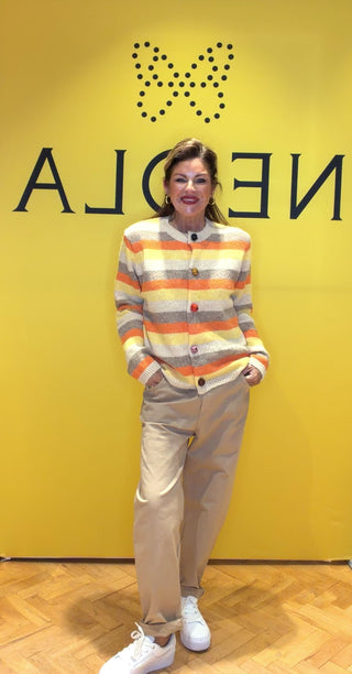 A soft and cosy striped cardigan designed for effortless everyday wear. Crafted in a lightweight knit with a smooth, comfortable feel, this piece features a classic round neckline, long sleeves and a button-through front finished with playful, multi-coloured buttons. The warm neutral and pastel stripes make it easy to style with denim or tailored trousers, perfect for layering through the seasons.