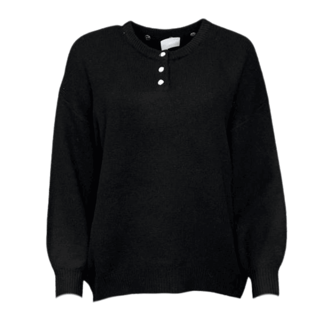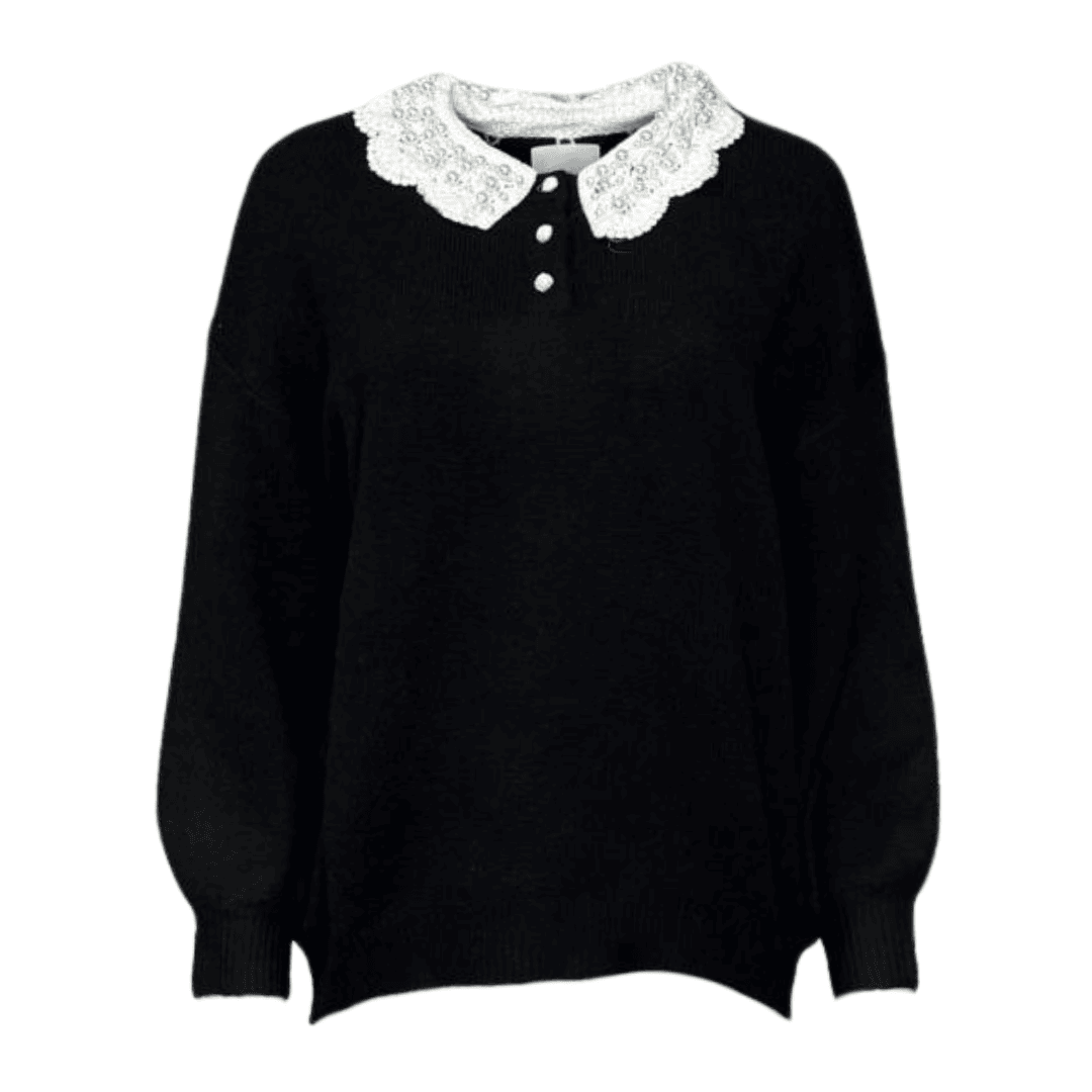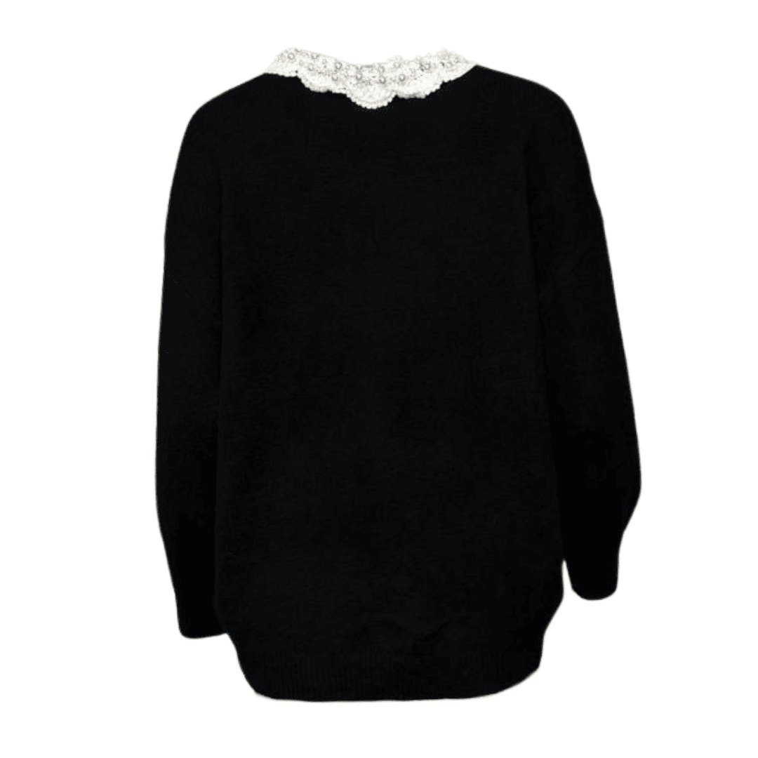 A cozy black knit jumper designed for versatility and charm. It features a detachable lace-trimmed collar adorned with delicate pearl details, allowing you to switch up your look effortlessly. Wear it with the collar for a touch of elegance, or remove it for a sleek, modern vibe. The button-up front lets you style it as a classic crew or a flattering V-neck — perfect for any mood or occasion.