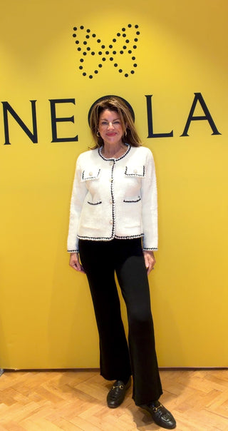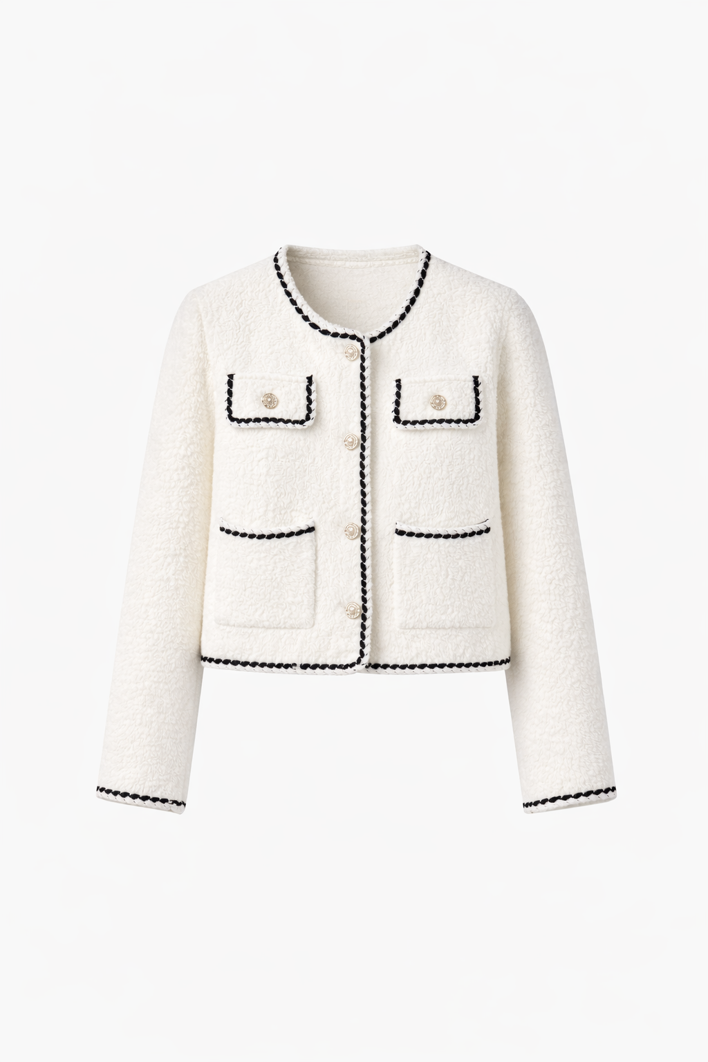 A timeless, Chanel-inspired bouclé jacket designed to elevate any outfit. Crafted in a soft cream textured fabric, this piece features a clean collarless neckline, contrast black trim, and statement gold-tone buttons for a polished finish. The boxy silhouette and practical front pockets create an effortless balance of structure and ease. Perfect for dressing up denim or layering over tailored pieces, this jacket is a refined staple you’ll reach for season after season.