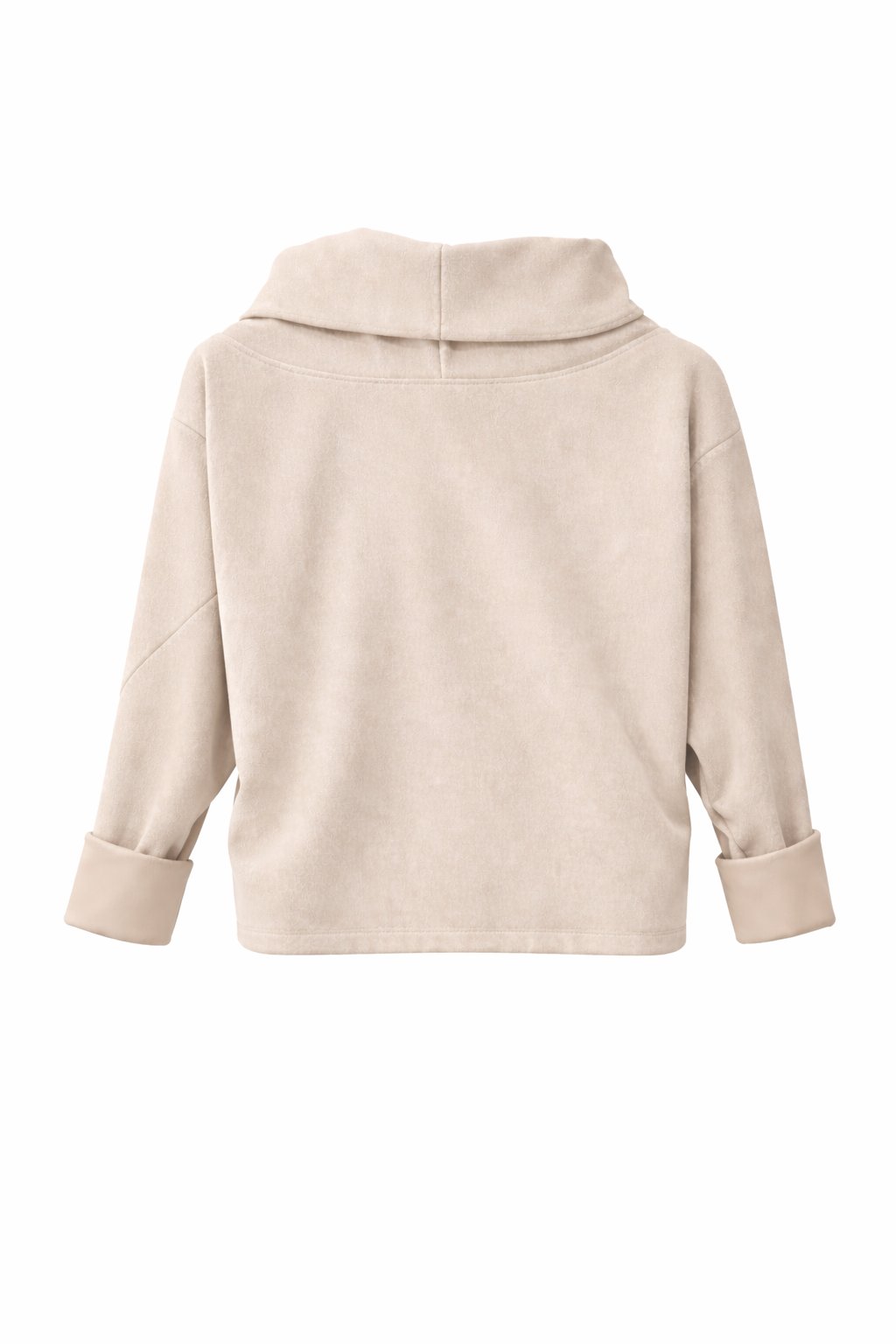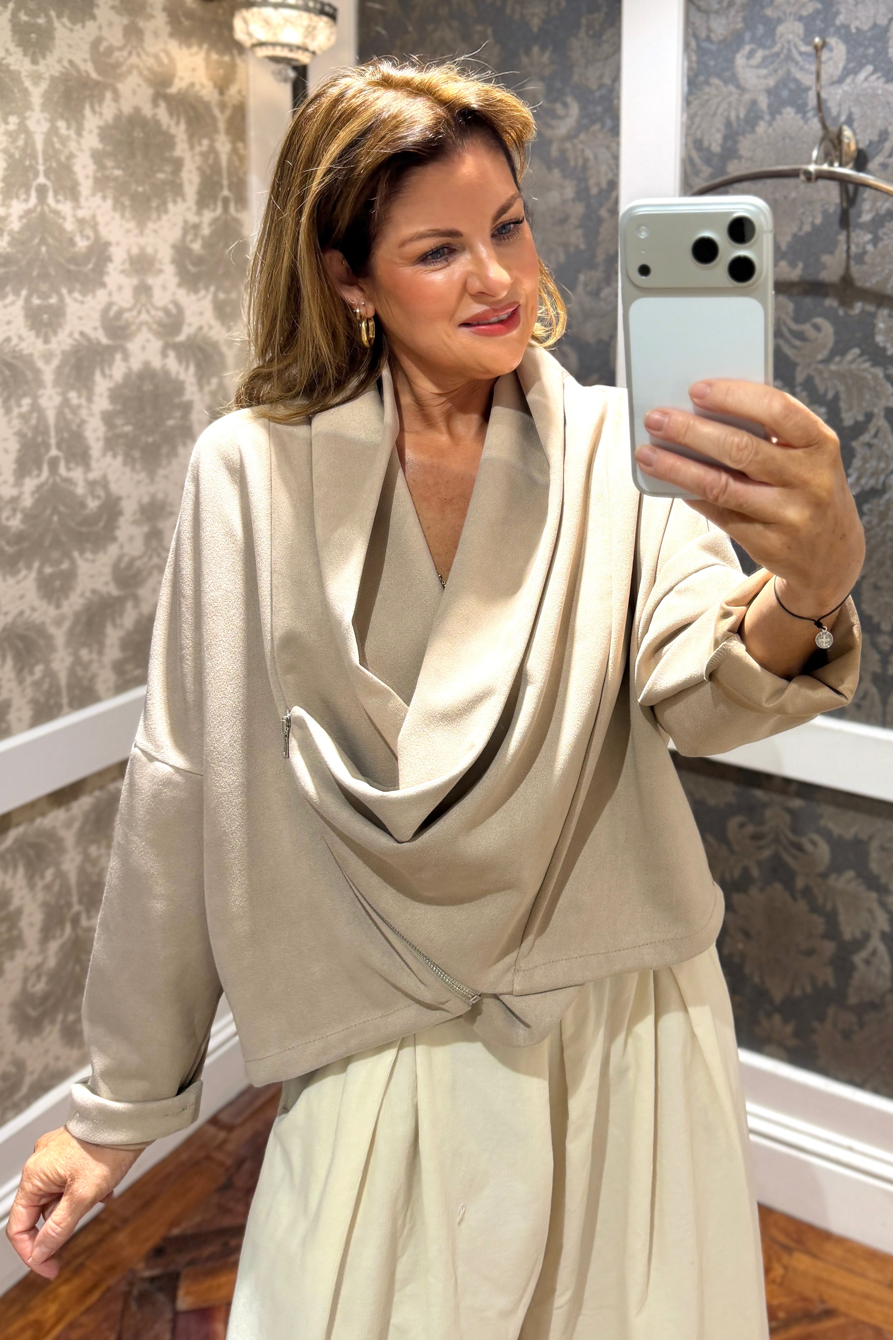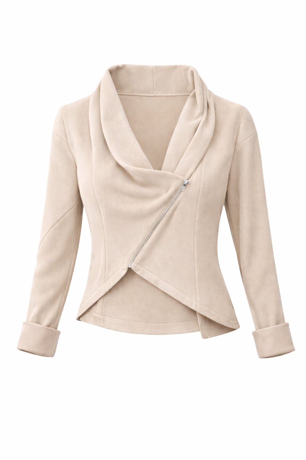A gorgeous coat featuring a quirky design in Sand. The asymmetrical zip creates a stunning cowl neckline when closed, and when unzipped, it drapes beautifully with effortless elegance. The tapered back adds swing and movement, while the soft, suede-like material enhances its luxurious feel.