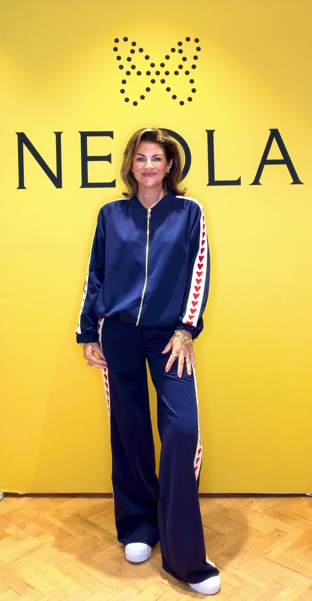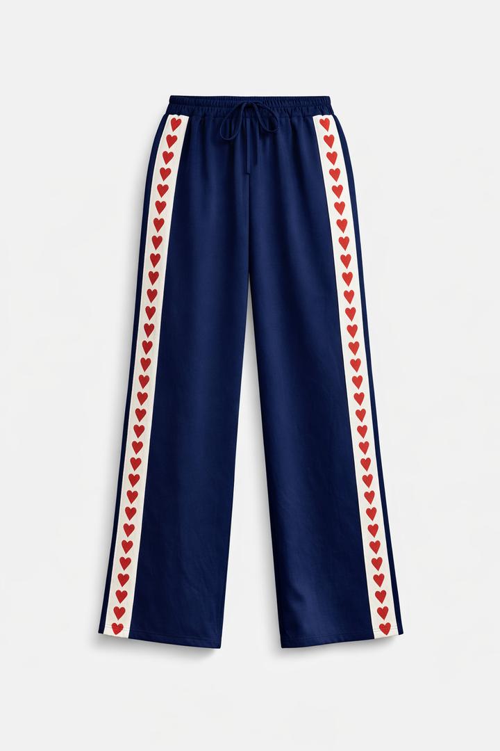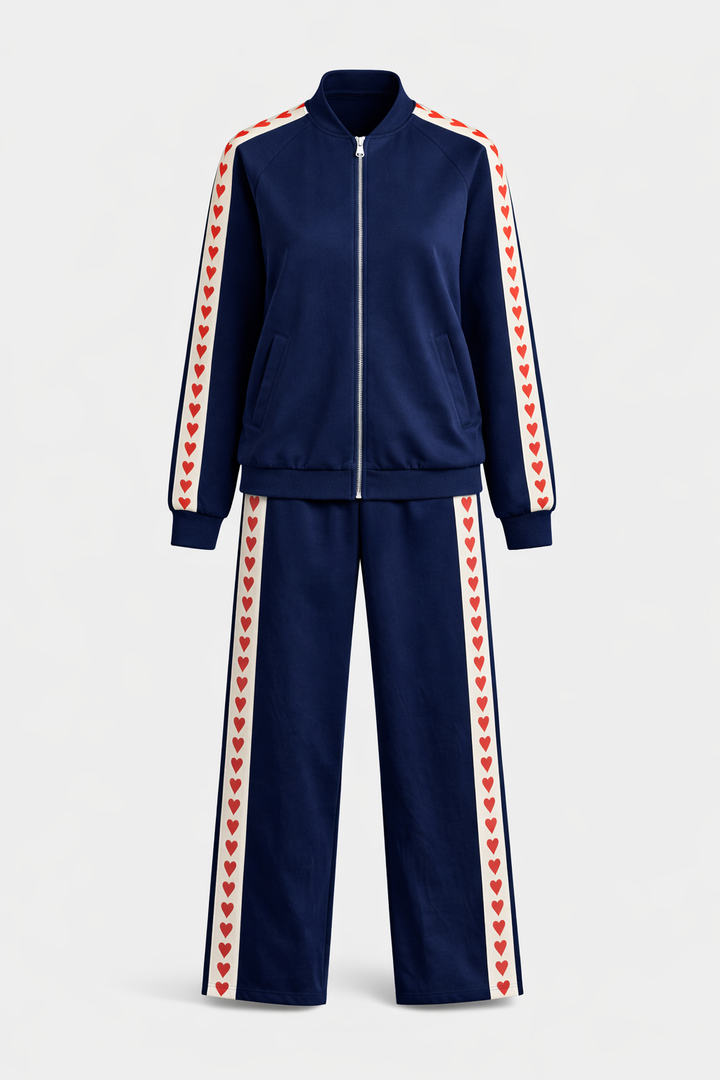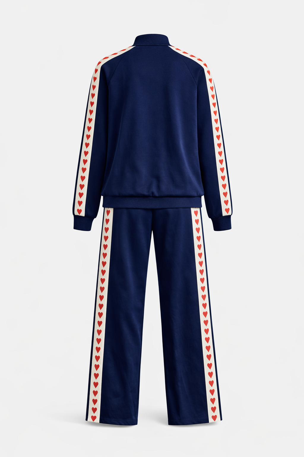 A playful yet elevated take on everyday loungewear. This Navy tracksuit features a relaxed, straight-leg trouser and a clean zip-front jacket, finished with signature white side stripes detailed with red heart motifs. Crafted in a soft, matte fabric with a comfortable elasticated waist and cuffs, it’s designed for effortless wear while still making a statement. Wear together as a set or style separately for an off-duty, street-ready look.
