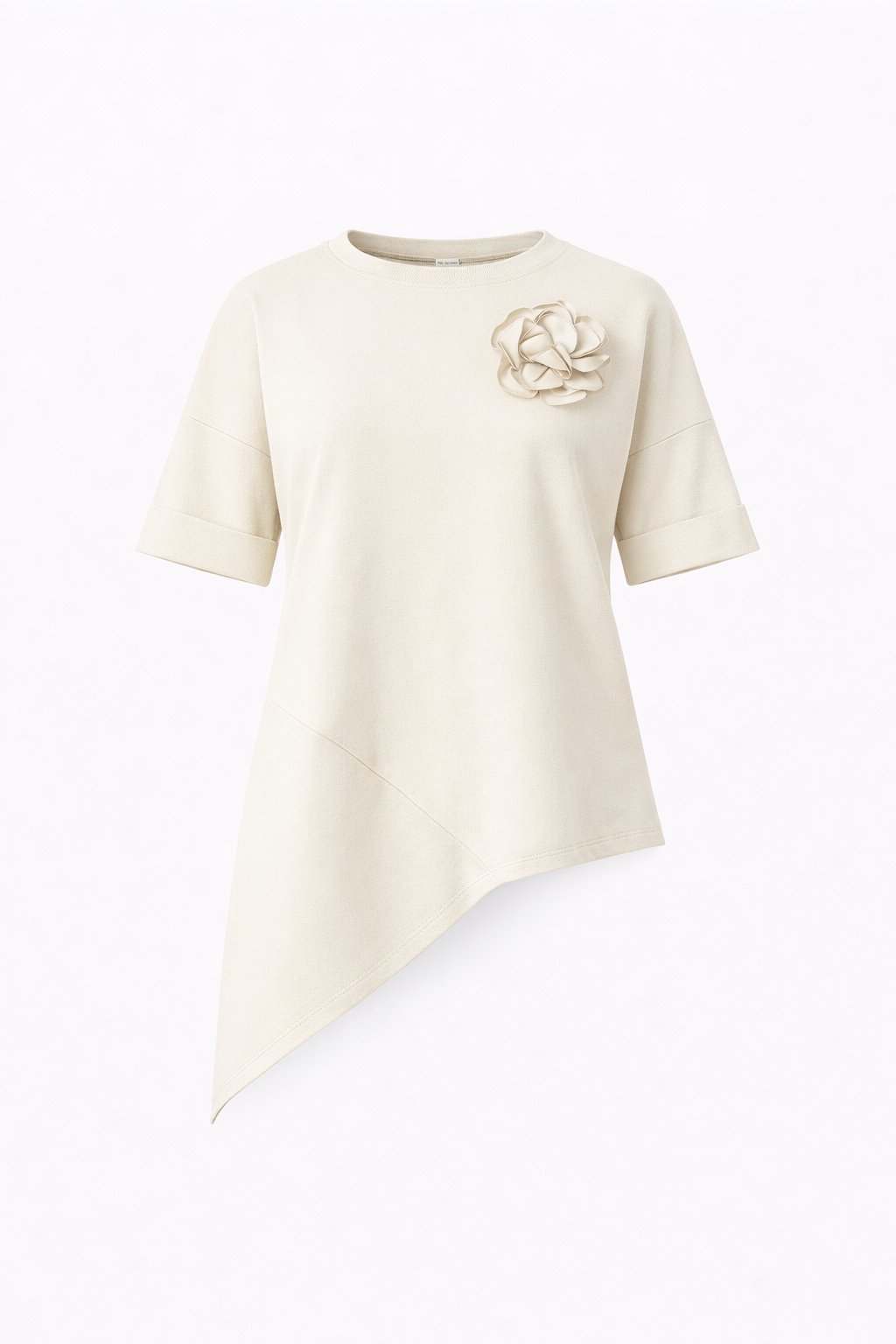 A modern, effortless top with a refined twist. Designed with a clean round neckline and short folded sleeves, this piece features a flattering asymmetrical hem that adds subtle shape and movement. Finished with a detachable fabric flower on the shoulder, allowing you to style it your way, it’s crafted in a smooth, matte fabric for a polished yet comfortable feel. Easy to dress up or down, this top pairs perfectly with tailored trousers, jeans, or skirts for an elegant everyday look.