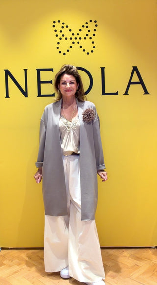 The Eddie Taupe Cardigan is a timeless open-front layer with a sleek longline silhouette and soft, structured fabric. Designed to drape effortlessly, it features full-length sleeves and practical pockets for everyday ease. Finished with a detachable floral brooch, it offers versatile styling—wear it plain for a clean, minimal look or add the flower for an elevated, feminine touch.