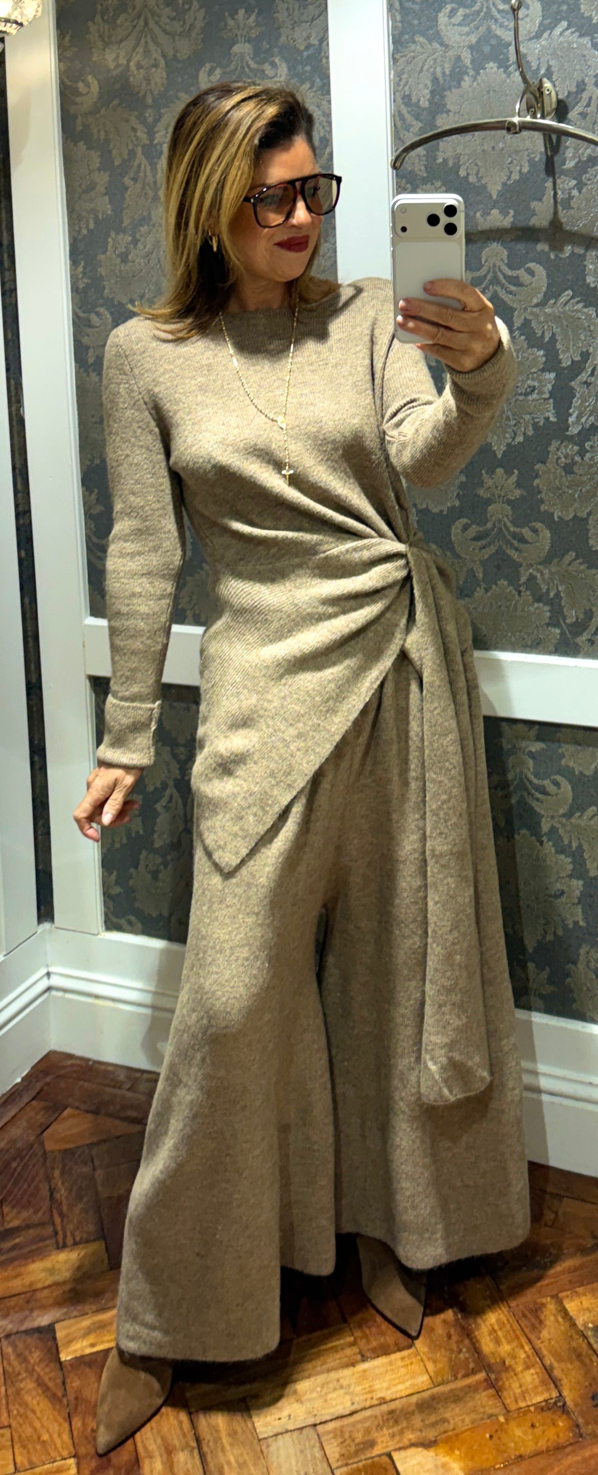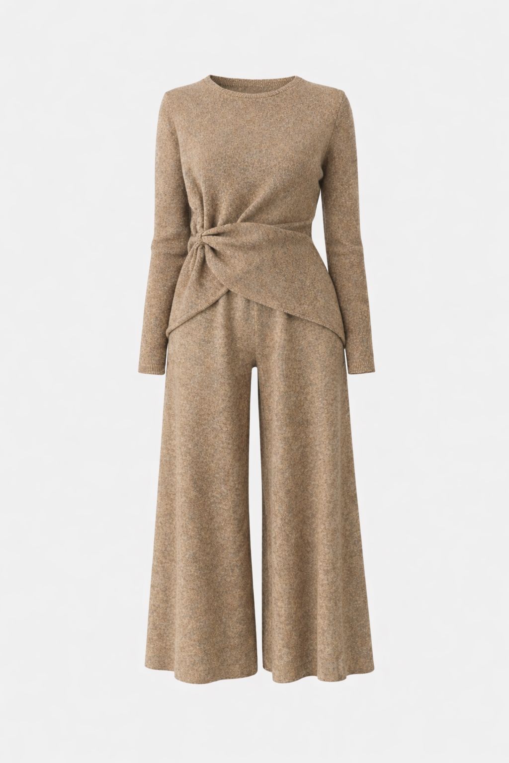 A soft, elevated knit two-piece designed for effortless everyday wear. This matching set features a long-sleeve top with a flattering twist detail at the waist and relaxed wide-leg trousers with a comfortable elasticated waistband. Crafted in a smooth, lightweight knit that drapes beautifully, it’s perfect worn together for a polished look or styled separately for versatile outfitting. Comfortable, flattering, and easy to dress up or down._