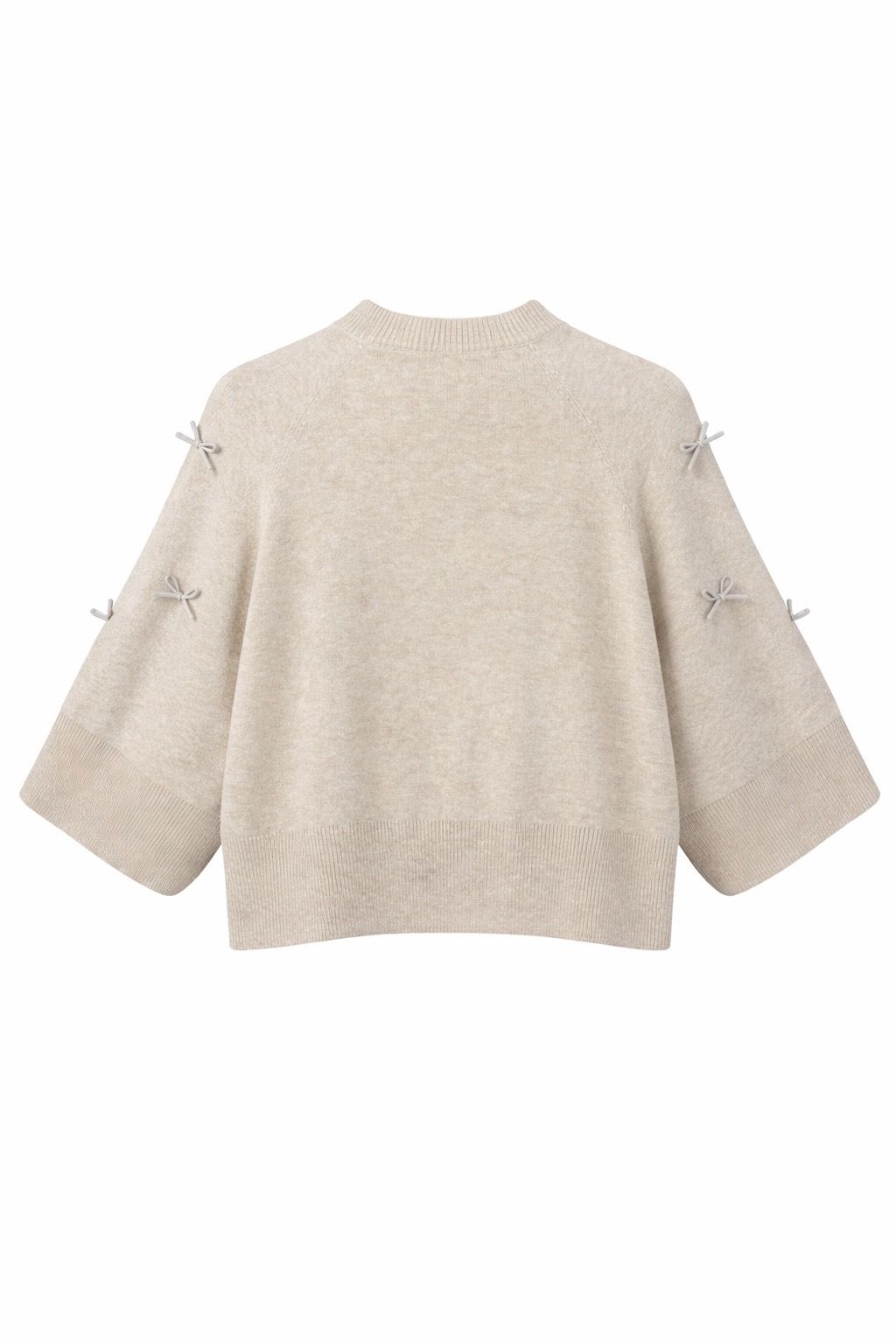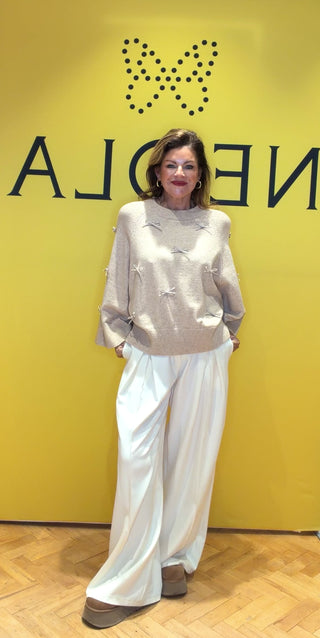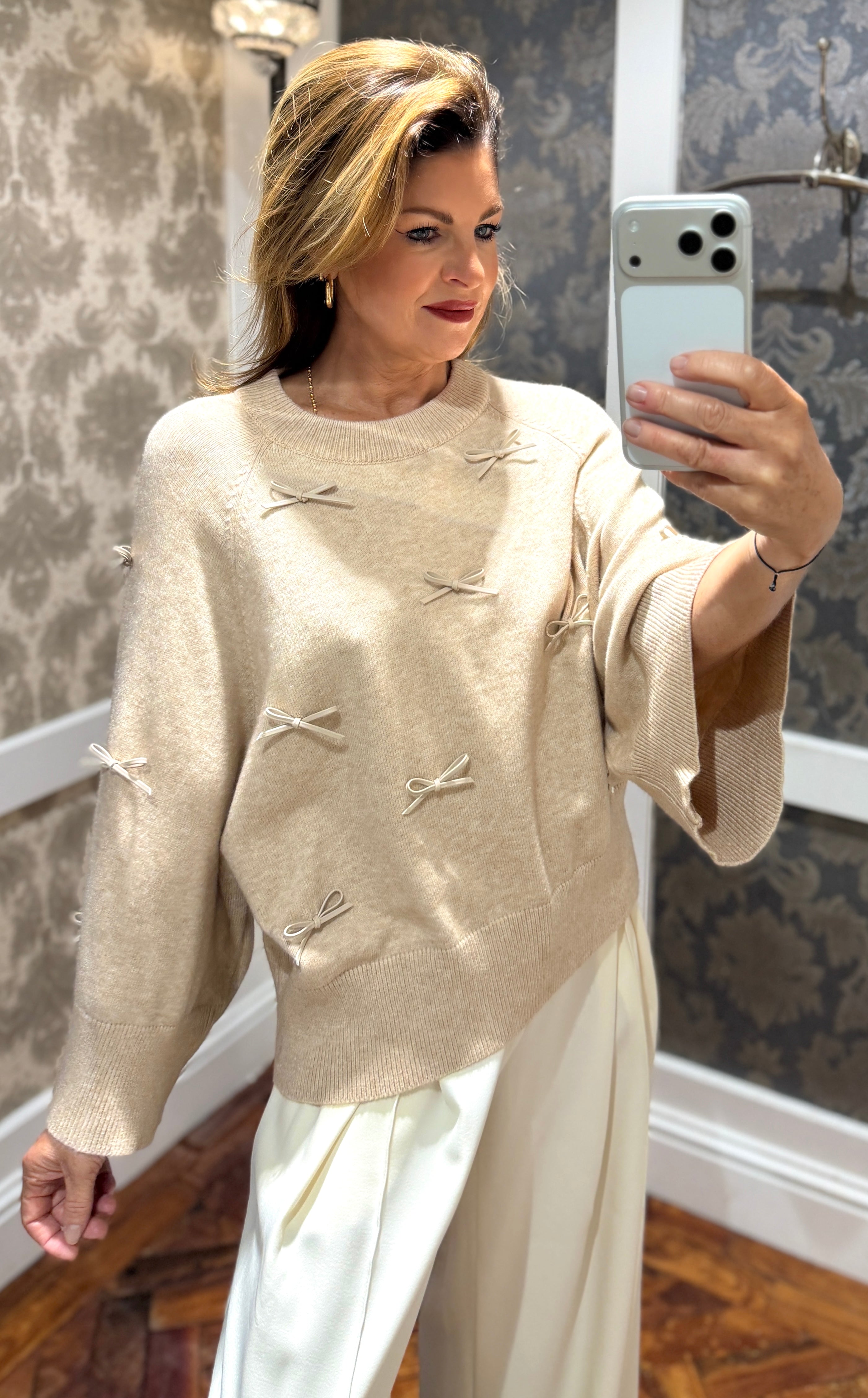 The Elsie Bow Knit is a soft, relaxed jumper designed to feel as good as it looks. Crafted in a light oatmeal tone, it features an easy boxy silhouette with wide sleeves and a clean ribbed neckline, cuffs, and hem. Delicate bow details are scattered across the front and sleeves, adding a playful twist to a timeless knit.
