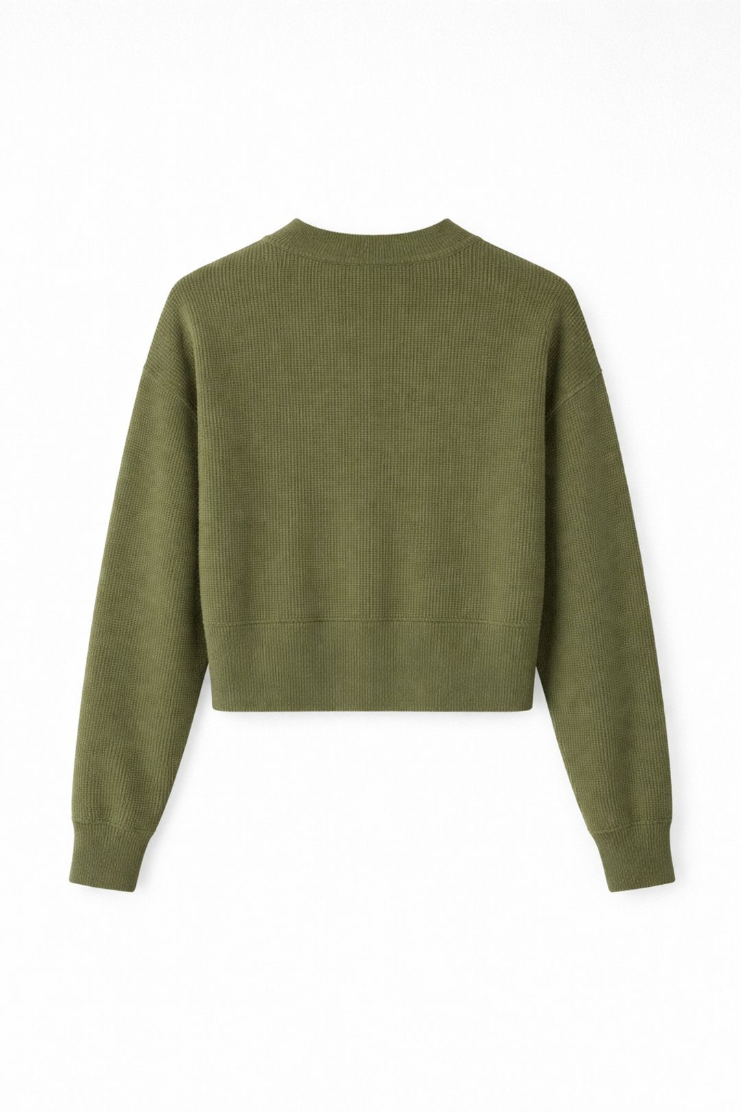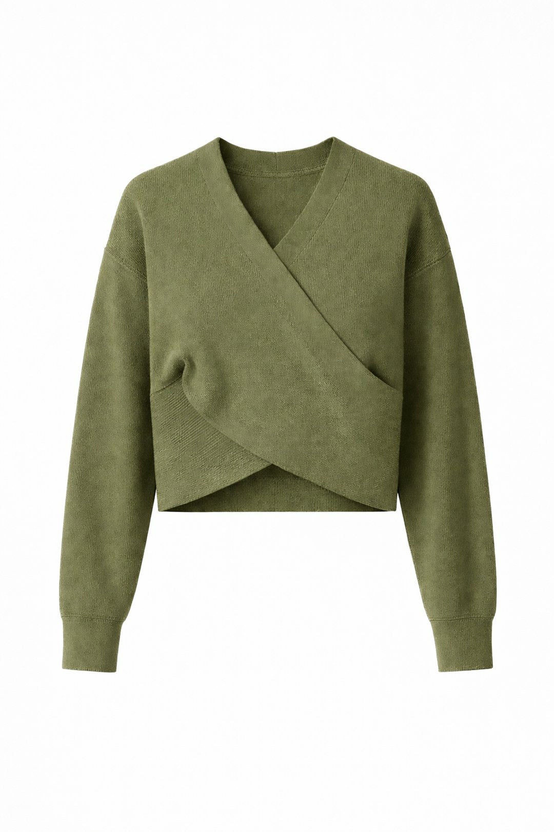 A modern ribbed knit wrap jumper designed with a flattering crossover front and a clean, minimalist back. Crafted in a soft, mid-weight knit, it features long sleeves, a cropped silhouette, and a structured V-neckline that drapes effortlessly on the body. Finished in a versatile olive tone, this piece balances comfort with understated elegance ideal for everyday styling or elevated casual looks.