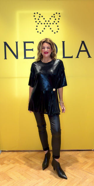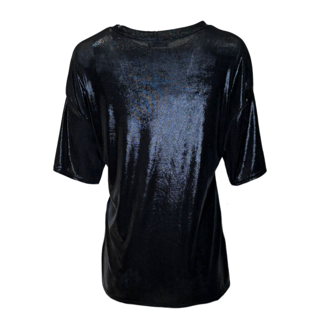 A stunning shiny black wet-look T-shirt that can be dressed up or down with ease—effortlessly cool and endlessly versatile. Featuring a beautifully cinched-in waist adorned with a gold flower brooch, it adds a touch of charm and individuality to any outfit. Perfect paired with trousers, Spanx, or your favourite statement pieces, this top transitions seamlessly from casual chic to night-out glam.