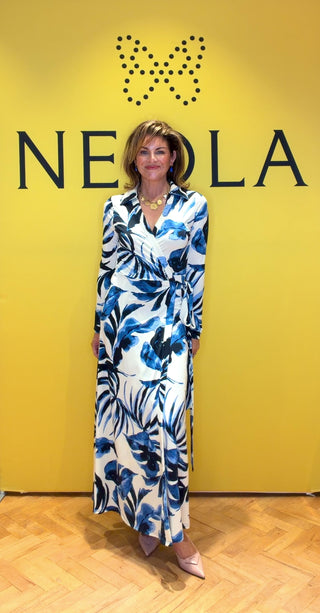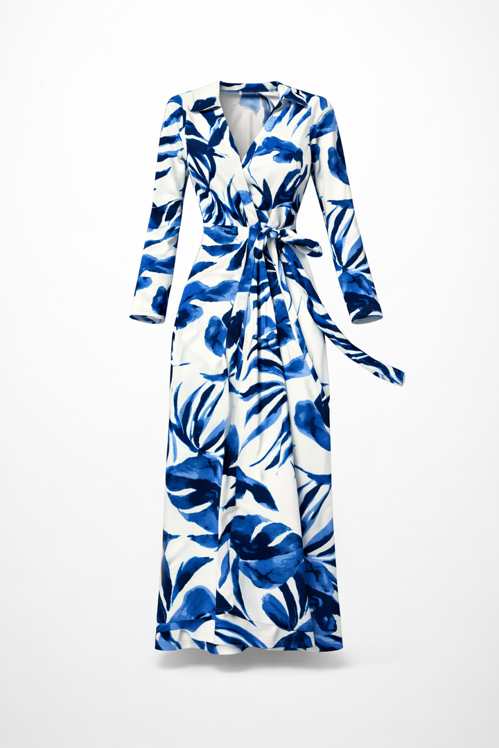 A flattering long-sleeve wrap dress designed with a clean, straight silhouette for an elegant, streamlined fit. Crafted in a soft, fluid fabric with a bold blue botanical print on an ivory base, it features a V-neckline, adjustable self-tie waist, and graceful maxi length. Effortless to wear and easy to style, this piece transitions seamlessly from daytime occasions to evening plans.