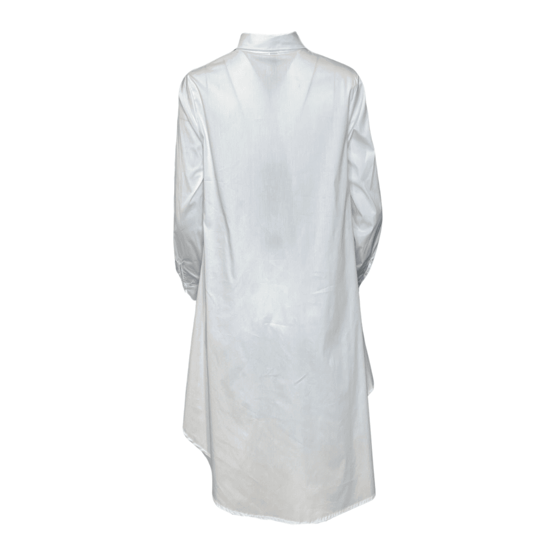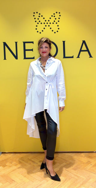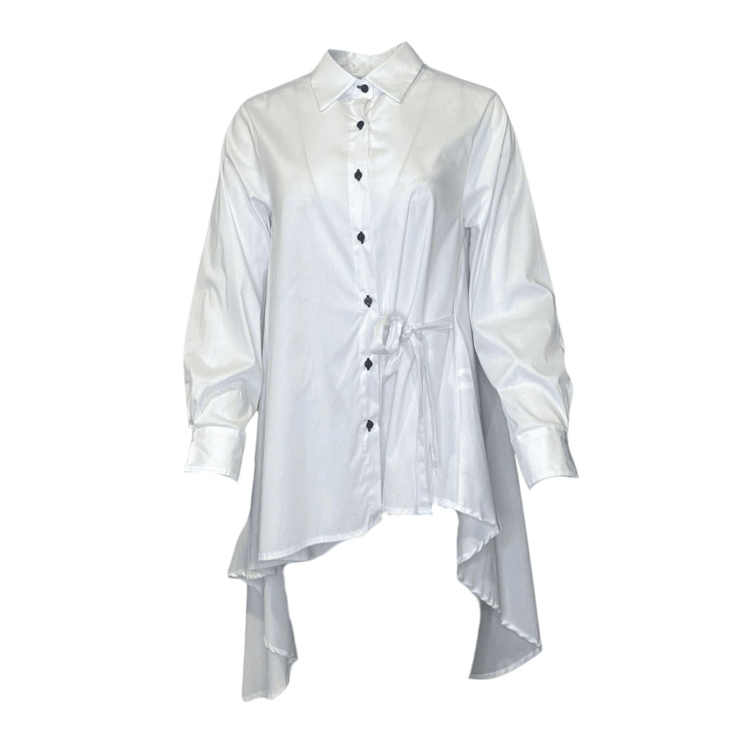 Effortlessly chic, this White shirt features a modern high-low hem—longer in the back, shorter in the front and long sleeves. A delicate side ribbon tie adds a feminine touch. Perfectly pairs with trousers or Spanx for a sleek, polished look.